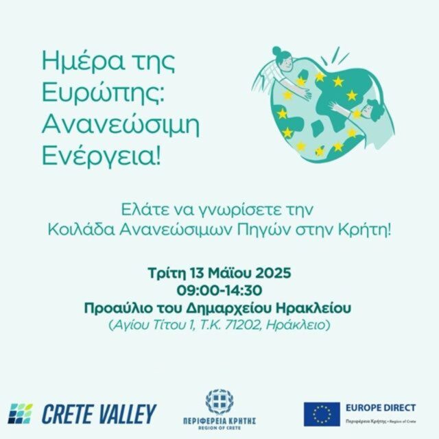 Με την ευκαιρία της Ευρωπαϊκής Εβδομάδας Βιώσιμης Ενέργειας, η Περιφέρεια Κρήτης και το Zentrum Fur Soziale Innovation συνεργάζονται με τους 41 εταίρους του χρηματοδοτούμενου από την ΕΕ έργου «CRETE VALLEY» και παρουσιάζουν λύσεις ανανεώσιμων πηγών ενέργειας στους πολίτες της Κρήτης, από τη Δευτέρα 12 Μαΐου έως την Παρασκευή 16 Μαΐου 2025.