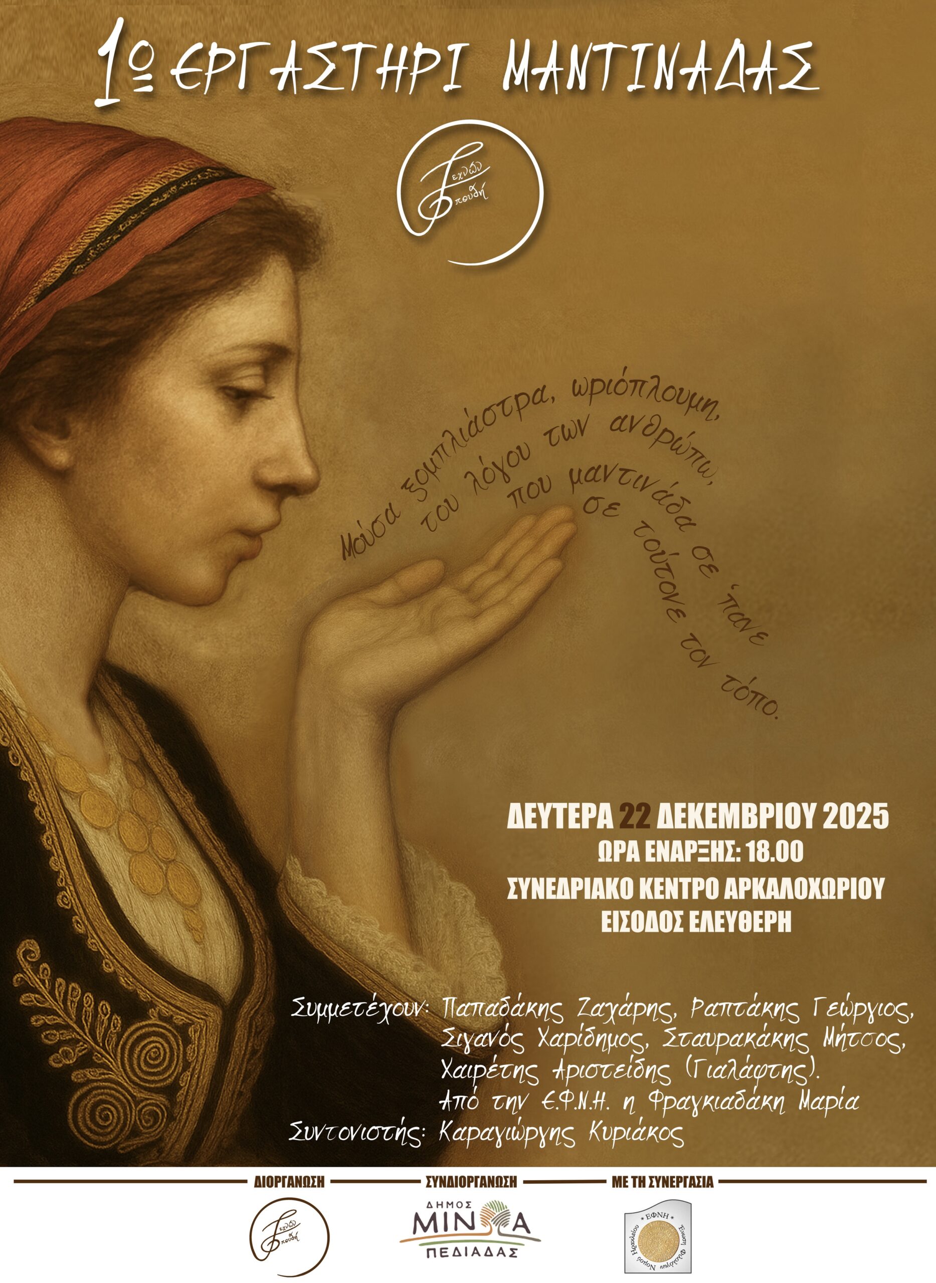 Ο Μουσικός και Λαογραφικός Σύλλογος «Τεχνών Σπουδή», διοργανώνει το 1ο Εργαστήρι Μαντινάδας, τη Δευτέρα 22 Δεκεμβρίου 2025, στις 18:00, στο Συνεδριακό Κέντρο Αρκαλοχωρίου.
