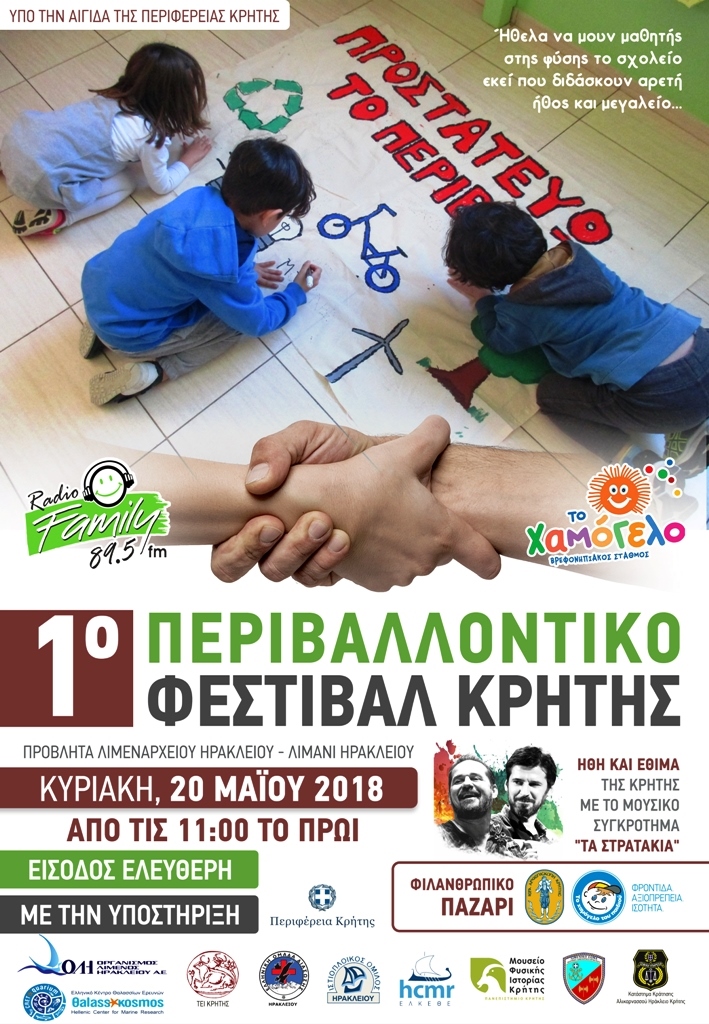 Με την αιγίδα της Περιφέρειας Κρήτης θα πραγματοποιηθεί το « 1ο Περιβαλλοντικό Φεστιβάλ Κρήτης» την Κυριακή 20 Μαΐου, από τις 11:00 έως 21:00 στον προβλήτα του Λιμεναρχείου Ηρακλείου και οργανώνουν ο βρεφονηπιακός σταθμός «Το Χαμόγελο» μαζί με το Family Radio, το Ελληνικό Κέντρο Θαλάσσιων Ερευνών «Θαλασσόκοσμος», το Μουσείο Φυσικής Ιστορίας Κρήτης, το ΤΕΙ Κρήτης, το Λιμενικό Σώμα, τον Οργανισμό Λιμένος Ηρακλείου (ΟΛΗ), το Κατάστημα Κράτησης Αλικαρνασσού.