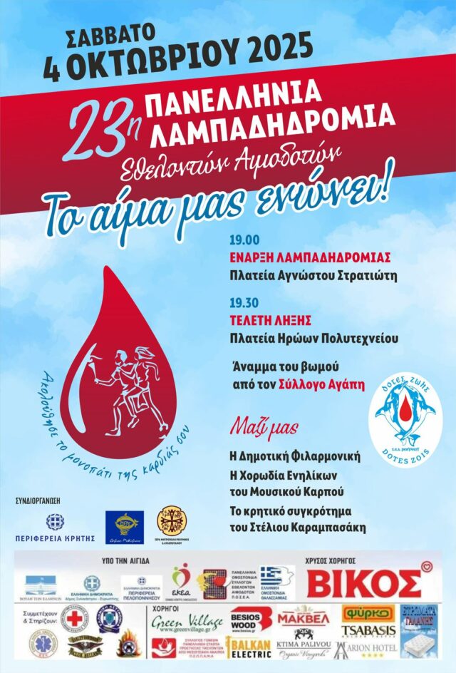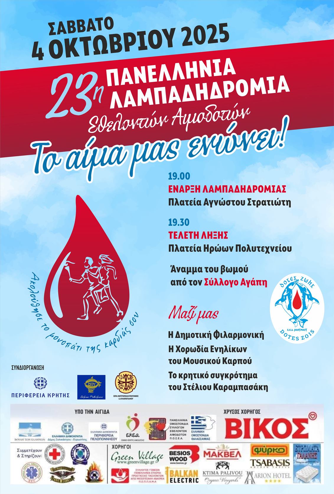 Ο Σύλλογος Εθελοντών Αιμοδοτών Ν. Ρεθύμνου «Δότες Ζωής» σε συνεργασία με την Πανελλήνια Ομοσπονδία Συλλόγων Εθελοντών Αιμοδοτών Π.Ο.Σ.Ε.Α., διοργανώνει για 23η χρονιά την ετήσια Λαμπαδηδρομία Εθελοντών Αιμοδοτών, το Σάββατο 4 Οκτωβρίου 2025, στο Ρέθυμνο.