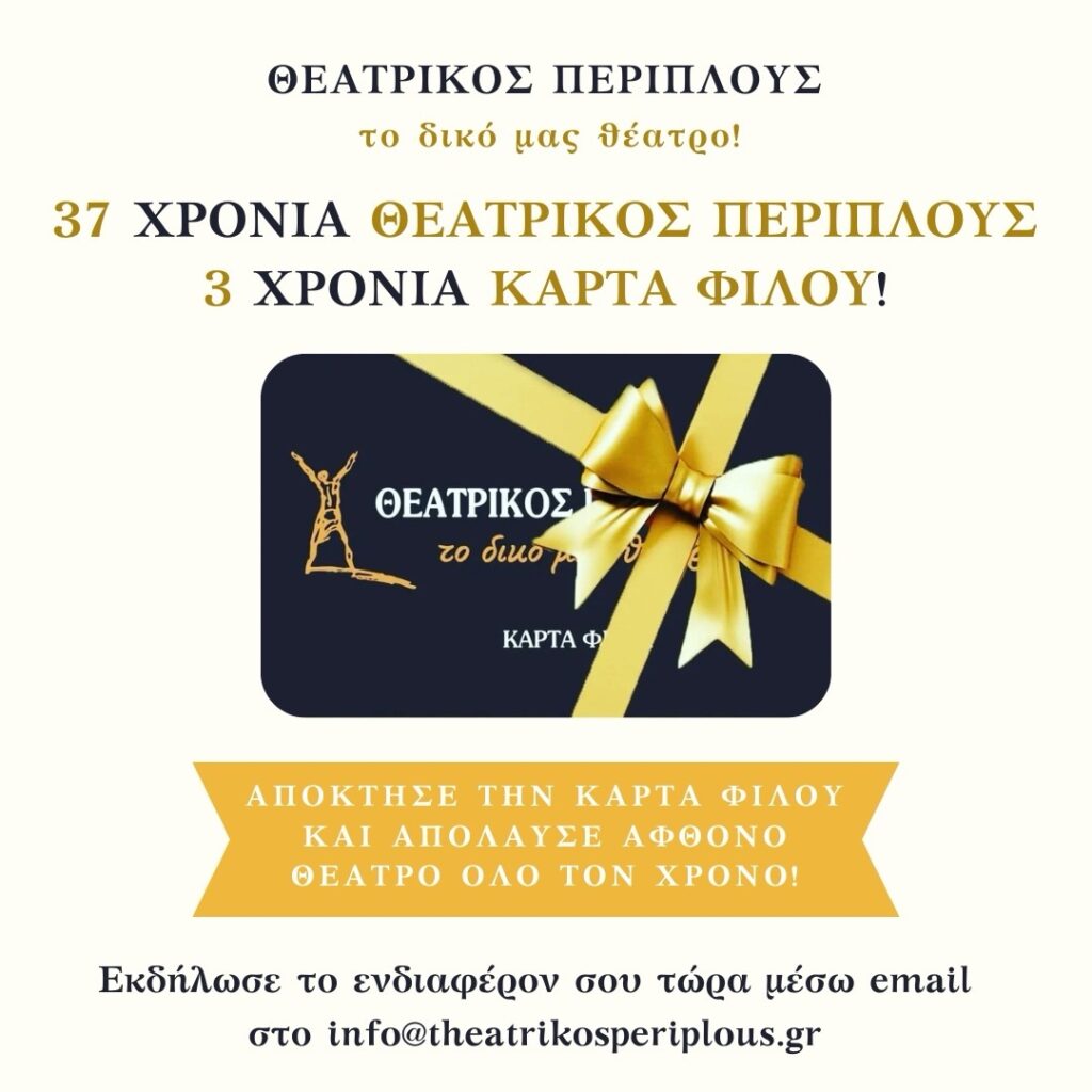 Βρείτε όλες τις πληροφορίες για την Κάρτα Φίλου, τα ειδικά προνόμια και τις εκπτώσεις στο: https://www.theatrikosperiplous.gr/?page_id=1684