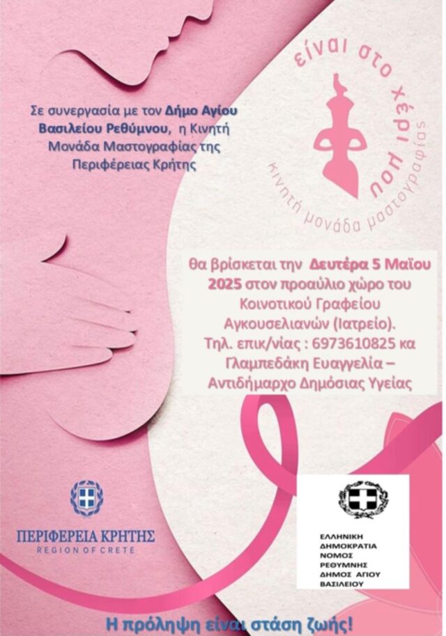 Σε αυτό το πλαίσιο η Κινητή Μονάδα Μαστογραφίας της Περιφέρειας Κρήτης σε συνεργασία με τον Δήμο Αγίου Βασιλείου θα βρεθεί ξανά κοντά μας και συγκεκριμένα: