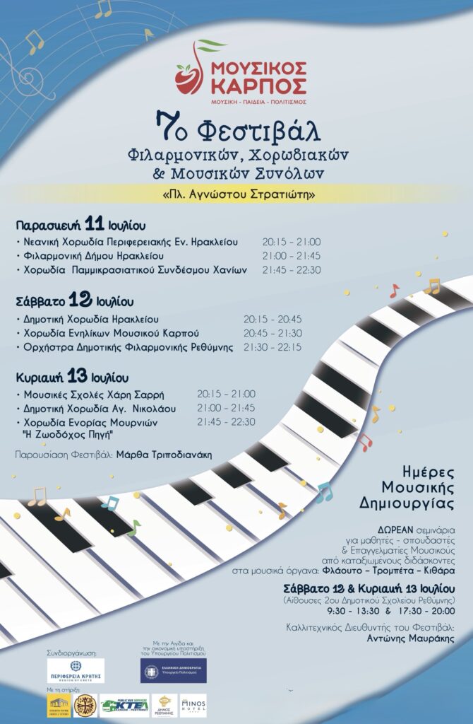 Το Φεστιβάλ, που έχει καθιερωθεί ως θεσμός, αποτελεί μια γιορτή της μουσικής, φέρνοντας κοντά ταλαντούχους καλλιτέχνες από την Κρήτη και όχι μόνο. Οι επιβλητικές Φιλαρμονικές, οι αρμονικές Χορωδίες και τα ποικίλα Μουσικά Σύνολα υπόσχονται να γεμίσουν την Πλατεία του Αγνώστου Στρατιώτη με μελωδίες που θα μαγέψουν κάθε ακροατή. Το κοινό θα έχει τη μοναδική ευκαιρία να απολαύσει ένα ευρύ φάσμα μουσικών ειδών –από κλασική και παραδοσιακή μουσική μέχρι σύγχρονες ελληνικές μελωδίες και τραγούδια– σε έναν χώρο που αποπνέει ιστορία και ομορφιά.