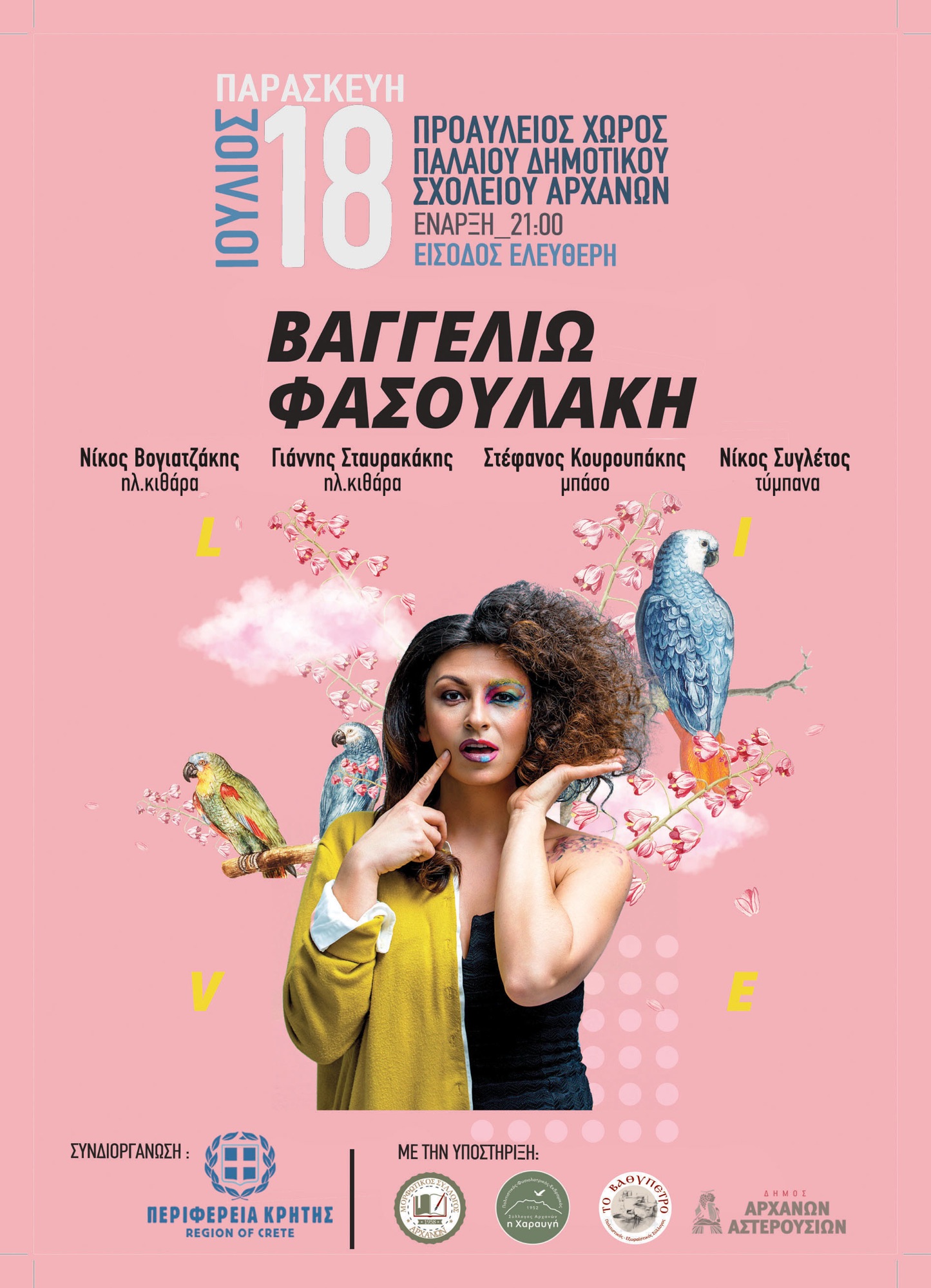 Μια ξεχωριστή μουσική εμπειρία υπόσχεται η συναυλία της Βαγγελιώς Φασουλάκη, που θα πραγματοποιηθεί στον προαύλιο χώρο του Παλαιού Δημοτικού Σχολείου Αρχανών (ΕΑΠ), με ώρα έναρξης στις 18 Ιουλίου και ώρα 21:00 με ελεύθερη είσοδο για το κοινό.