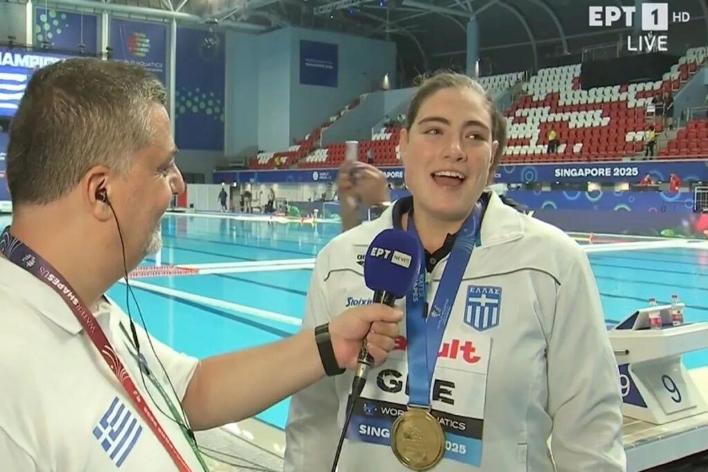 Η Ρεθυμνιώτισσα αθλήτρια λίγο μετά την απονομή του χρυσού μεταλλίου μίλησε στην κάμερα της ΕΡΤ δηλώνοντας: “Δεν το έχω συνειδητοποιήσει ακόμα. Είμαστε πάρα πολύ χαρούμενες και περήφανες. Ειλικρινά αυτή η στιγμή δεν έχει λόγια.