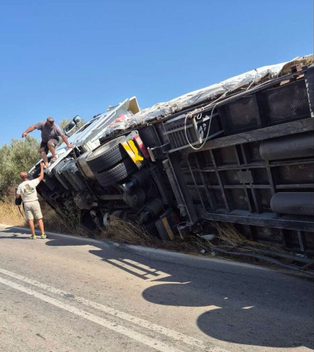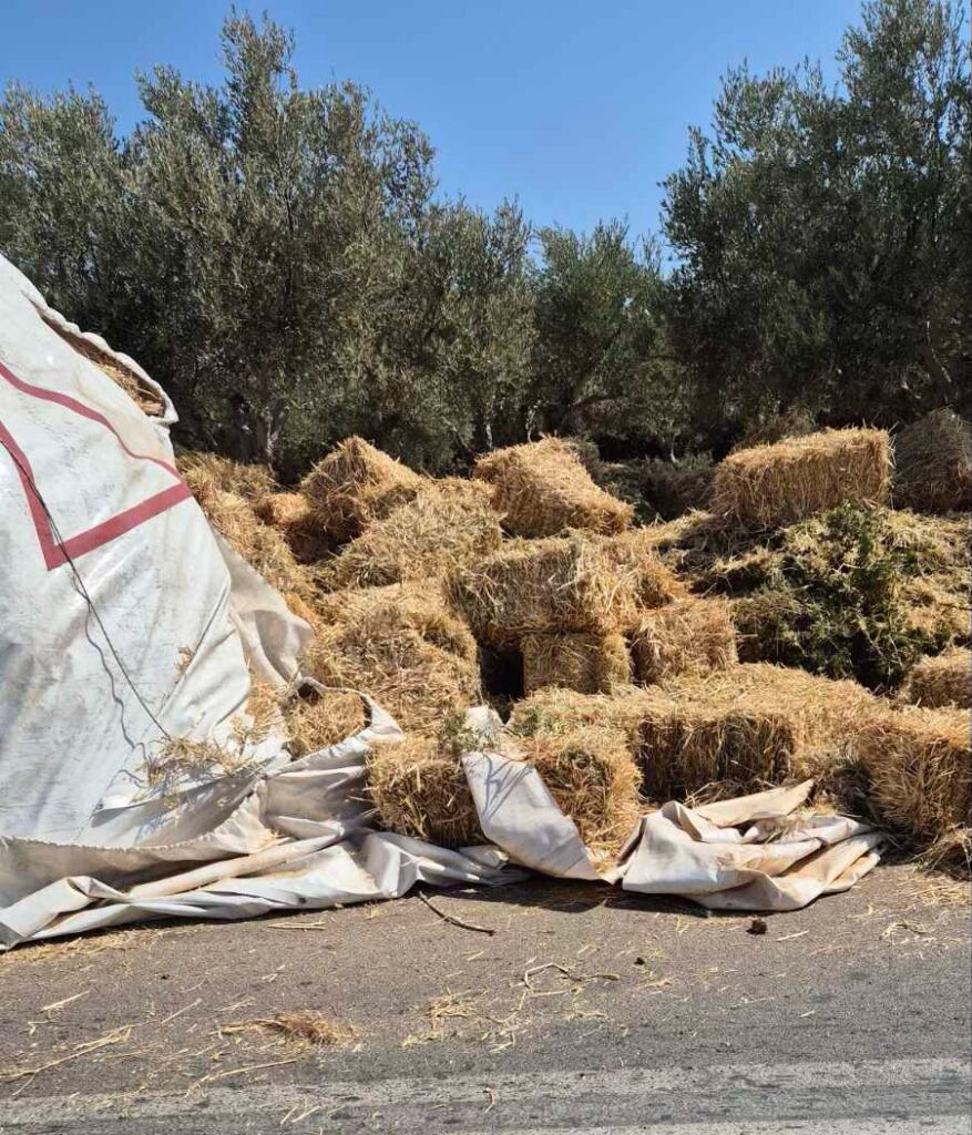 Τροχαίο ατύχημα σημειώθηκε το μεσημέρι της Παρασκευής στην Παλαιά Εθνική Οδό, κοντά στην περιοχή «Αλεξάνδρου Χάνι», όταν φορτηγό όχημα που μετέφερε μπάλες άχυρου, ανατράπηκε και βρέθηκε στο πλάι με αποτέλεσμα να αποκλείσει μέρος του δρόμου!