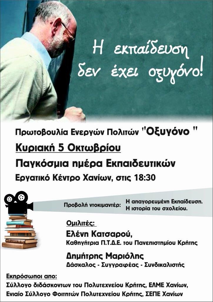 Η Πρωτοβουλία ενεργών πολιτών Χανίων «Οξυγόνο», με αφορμή την Παγκόσμια ημέρα του Εκπαιδευτικού, θα πραγματοποιήσει εκδήλωση με τίτλο «Η Εκπαίδευση δεν έχει οξυγόνο» την Κυριακή 5 Οκτωβρίου στις 6.30 μμ, στο Εργατικό Κέντρο Χανίων.