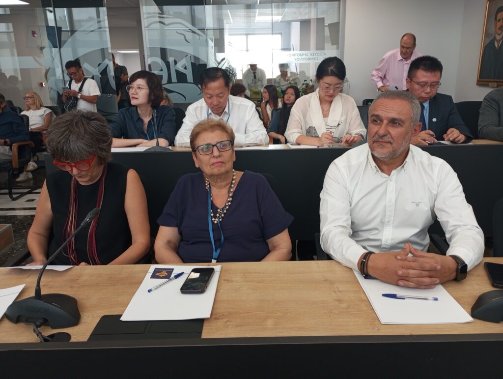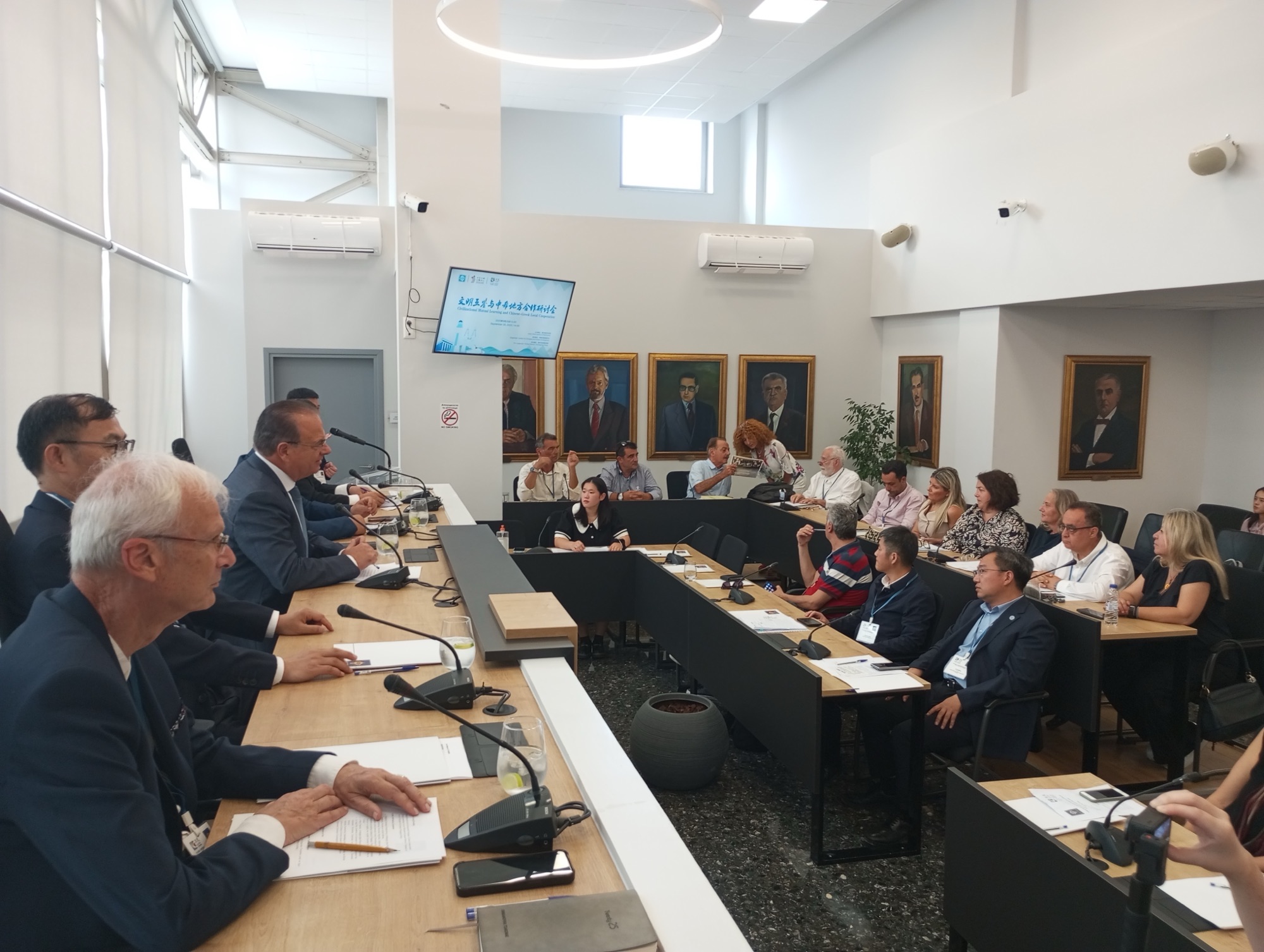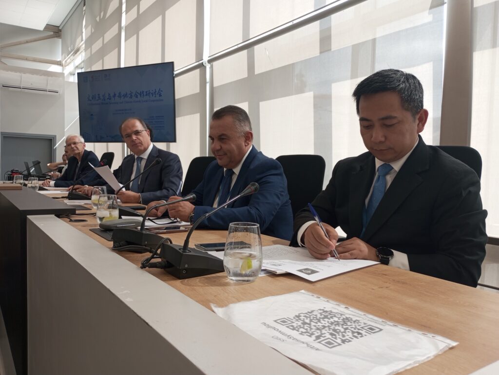 Η Καθηγήτρια Χλόη Μπάλα, Πρόεδρος του Κέντρου Ελληνικών και Κινεζικών πολιτισμών, ο Αναπλ. Καθηγητής κ. Γεώργιος Σταματόπουλος, Αντιπρύτανης Οικονομικών και Υποδομών του Πανεπιστημίου Κρήτης και με διαδικτυακή διασύνδεση ο Ομότιμος Καθηγητής Νίκος Σταμπολίδης, Γενικός Διευθυντής του Μουσείου Ακρόπολης.