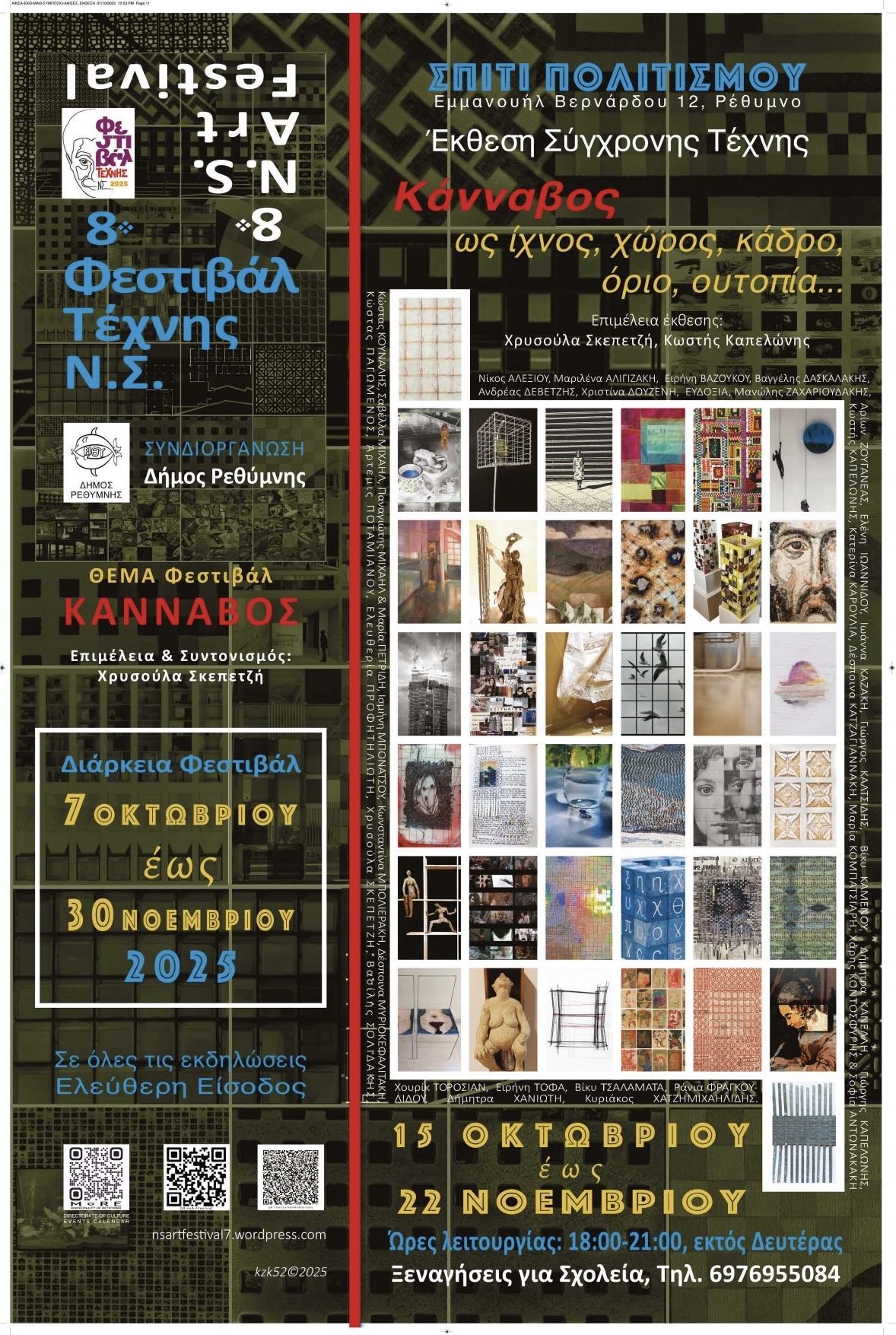 Το 8ο Φεστιβάλ Τέχνης Ν.Σ. σε συνδιοργάνωση με το Τμήμα Πολιτισμού του Δήμου Ρεθύμνης παρουσιάζει από 15 Οκτωβρίου στο Ρέθυμνο, την Έκθεση Σύγχρονης Τέχνης με θέμα: «Κάνναβος (ως ίχνος, χώρος, κάδρο, όριο, ουτοπία…)»