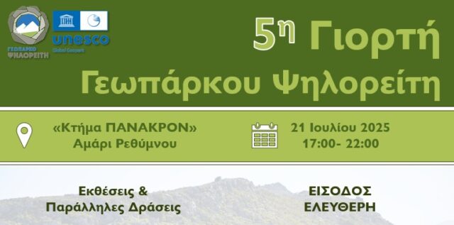 Η 5η Γιορτή Γεωπάρκου Ψηλορείτη θα πραγματοποιηθεί τη Δευτέρα 21 Ιουλίου 2025 με ώρα έναρξης στις 17:00, στο Κτήμα Πάνακρον, Δήμου Αμαρίου (έναντι Σχολής Ασωμάτων).