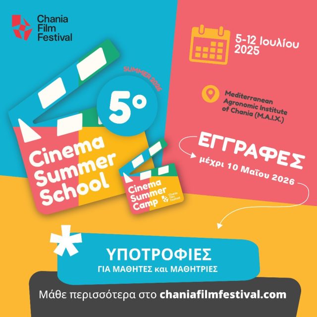 Το Φεστιβάλ Κινηματογράφου Χανίων και η Πολιτιστική Εταιρεία Κρήτης έχουν εξασφαλίσει την υποστήριξη για το «Θερινό Σχολείο Κινηματογράφου» / «CinemaSummerCamp» 2026 θεσμικών φορέων και ιδιωτών χορηγών με αποτέλεσμα να μπορούν να προσφέρουν σημαντικό αριθμό υποτροφιών με ΜΟΝΑΔΙΚΟ ΚΑΙ ΣΥΝΟΛΙΚΟ ΚΟΣΤΟΣ ΣΥΜΜΕΤΟΧΗΣ 100 ΕΥΡΩ [ Διαμονή, Διατροφή, Εκπαίδευση, Εκδρομές]