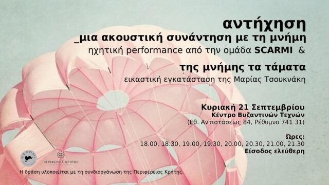 Η δράση «Αντήχηση» είναι μια ηχητική performance, η οποία αξιοποιεί την τεχνική της ακρόασης με ακουστικά, και βασίζεται στην γραπτή προφορική μαρτυρία της Ιωάννας Παρρά, το γένος Παπουτσάκη, που γεννήθηκε το 1926 στον Αλικιανό Χανίων η οποία έζησε από κοντά τα γεγονότα του Β΄ Παγκοσμίου Πολέμου στην Κρήτη. Η συνέντευξή της καταγράφηκε το 2014 από τον τότε μαθητή Νικόλαο Μελικίδη.