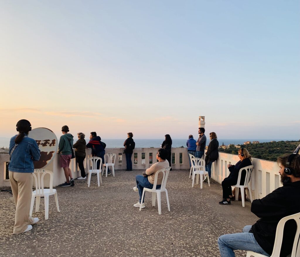 Στο πλαίσιο της δράσης, οι θεατές καλούνται να συμμετάσχουν σε μια τελετουργική εμπειρία ακρόασης, σε ένα σημείο με θέα, φορώντας ακουστικά. Μέσα από την αφήγηση και τη συνοδευτική πρωτότυπη μουσική σύνθεση, ο χώρος μετατρέπεται σε τόπο μνήμης και συναισθηματικής σύνδεσης με το παρελθόν.