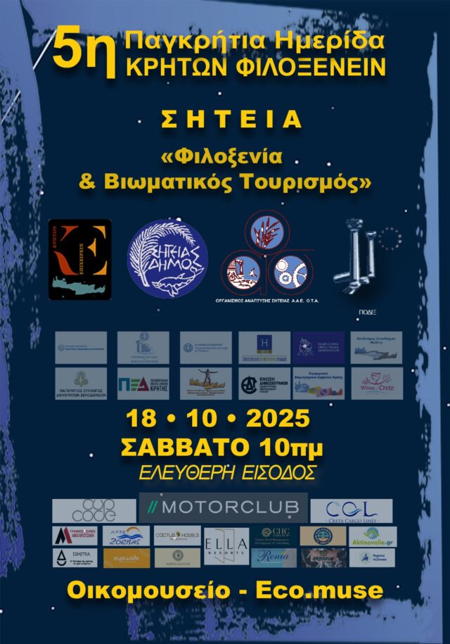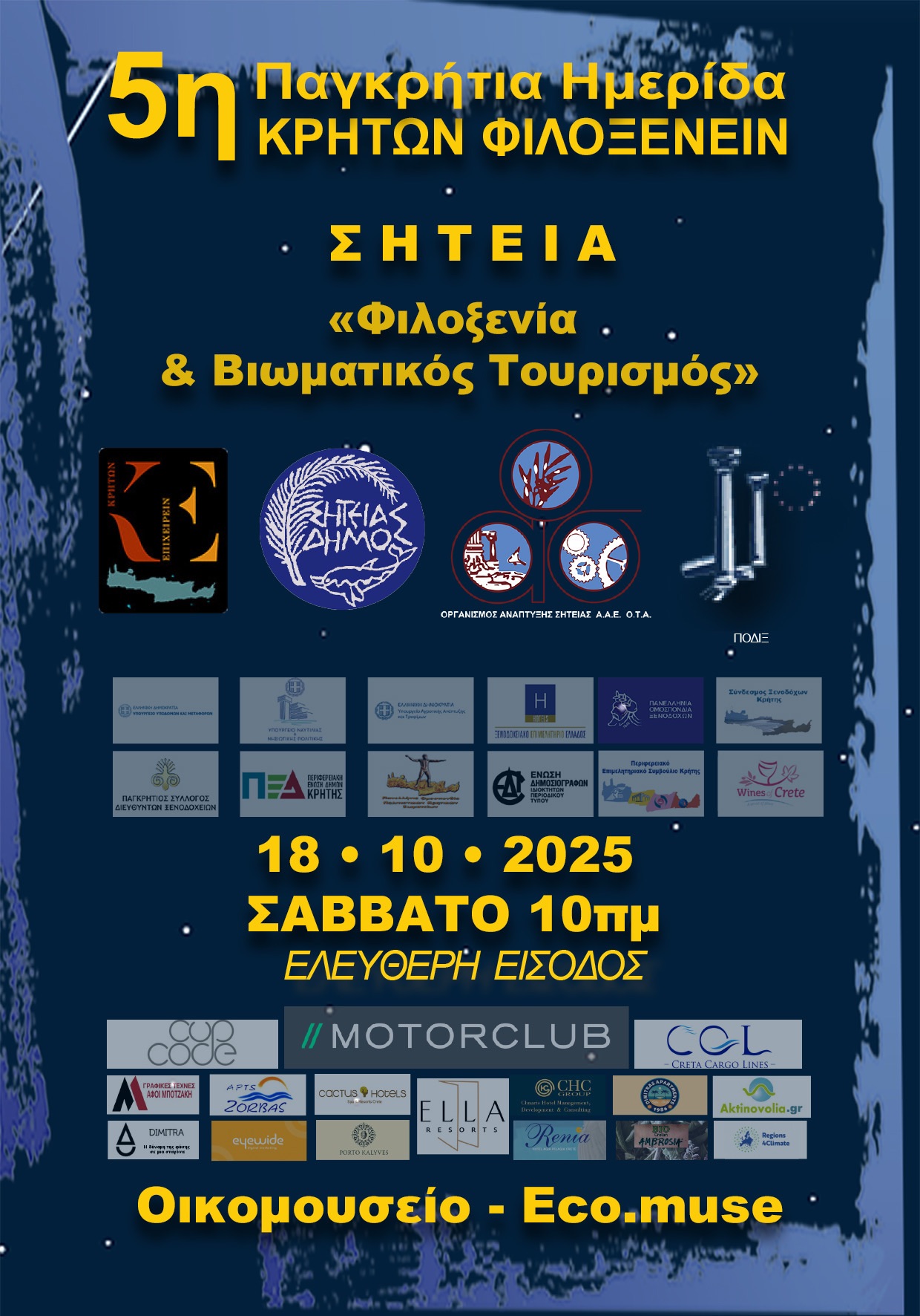 Η πόλη της Σητείας, ένας τόπος όπου η φιλοξενία είναι τρόπος ζωής, φιλοξενεί την 5η Παγκρήτια Ημερίδα Τουρισμού «Κρητών Φιλοξενείν», το Σάββατο 18 Οκτωβρίου 2025, στις 10:00 π.μ., στο Οικομουσείο του Δήμου Σητείας, με θέμα «Φιλοξενία & Βιωματικός Τουρισμός».  Η είσοδος είναι ελεύθερη για το κοινό και τους επαγγελματίες του τουρισμού.