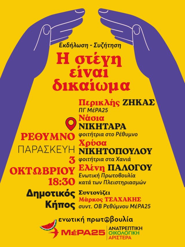 Η ενωτική πρωτοβουλία ΜέΡΑ25 | Ανατρεπτική Οικολογική Αριστερά διοργανώνει στο Ρέθυμνο ανοιχτή εκδήλωση – συζήτηση με θέμα: «Το δικαίωμα στη στέγη».