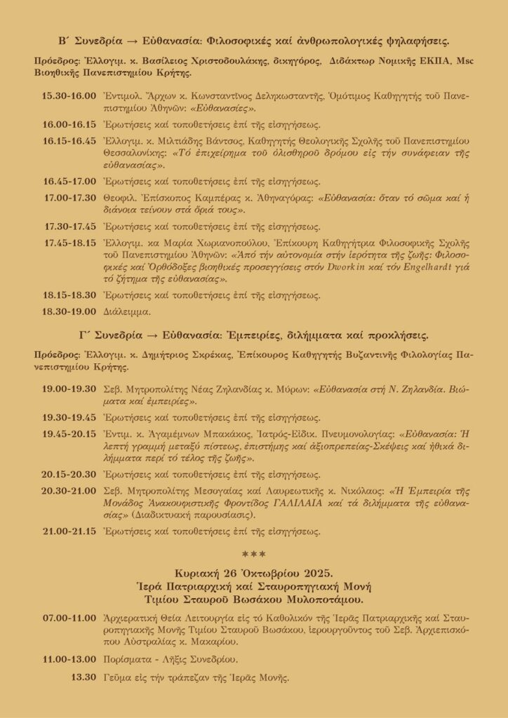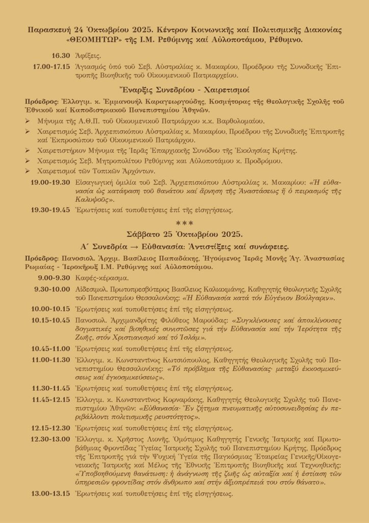 Με θέμα την «Ευθανασία» θα πραγματοποιηθεί, από 24 έως 26 Οκτωβρίου 2025, στο Κέντρο Κοινωνικής και Πολιτισμικής Διακονίας «Θεομήτωρ» της Ιεράς Μητροπόλεως Ρεθύμνης και Αυλοποτάμου, καθώς και στην Ιερά Πατριαρχική και Σταυροπηγιακή Μονή Τιμίου Σταυρού Βωσάκου, στο Μυλοπόταμο, το 3ο Συνέδριο Βιοηθικής του Οικουμενικού Πατριαρχείου.
