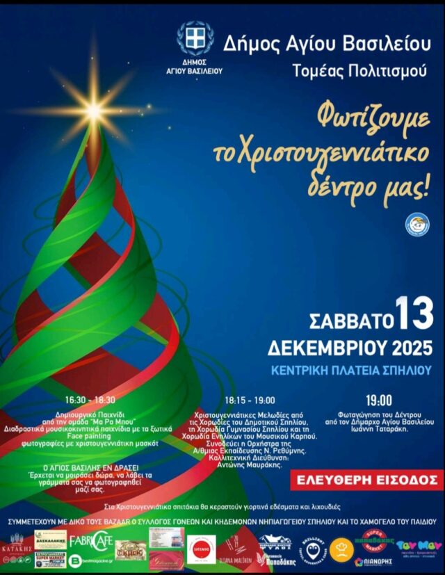 Σας προσκαλούμε να ζήσουμε όλοι μαζί μικροί & μεγάλοι, τη μαγεία των Χριστουγέννων, στη φωταγώγηση του Χριστουγεννιάτικου Δέντρου του Δήμου Αγίου Βασιλείου.
