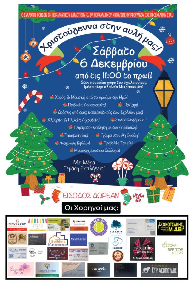 Η εκδήλωση, με τίτλο «Χριστούγεννα στην αυλή μας», υπόσχεται μια μέρα γεμάτη εκπλήξεις: χορό και μουσική από την Ηρώ, παιδικές κατασκευές, παζάρι, δράσεις από τους εκπαιδευτικούς, λιχουδιές, ζεστά ροφήματα, facepainting, προβολές ταινιών, αναγνώσεις βιβλίων, ακόμη και πειράματα-έκπληξη από τον Άη Βασίλη.