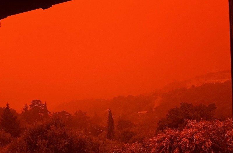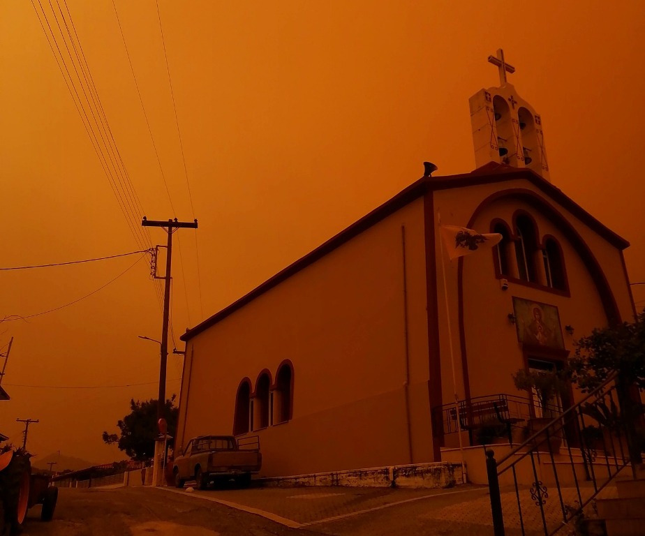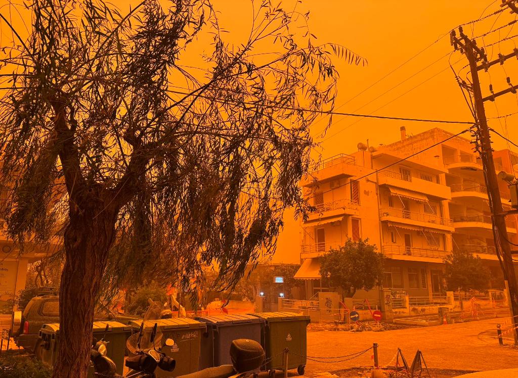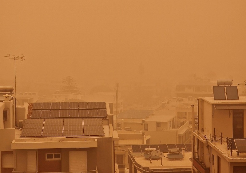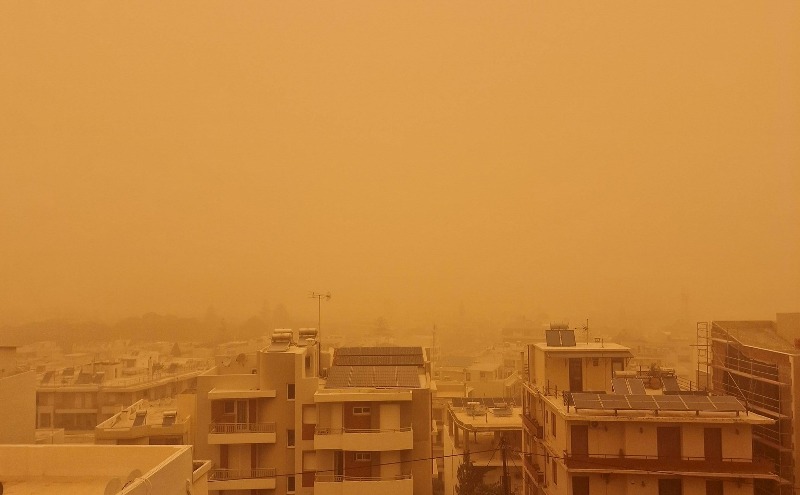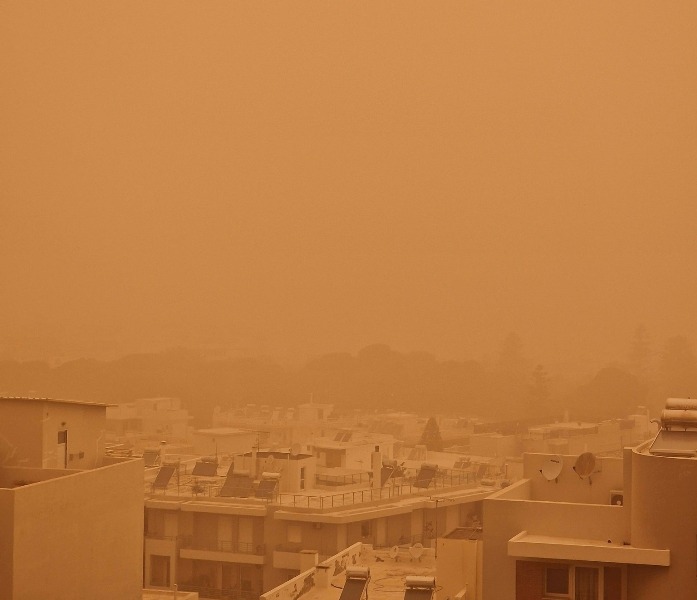 Η έντονη μεταφορά αφρικανικής σκόνης έχει καλύψει την ατμόσφαιρα, δίνοντας στον ουρανό ένα απόκοσμο πορτοκαλί χρώμα, ενώ η ορατότητα σε πολλές περιοχές είναι περιορισμένη.