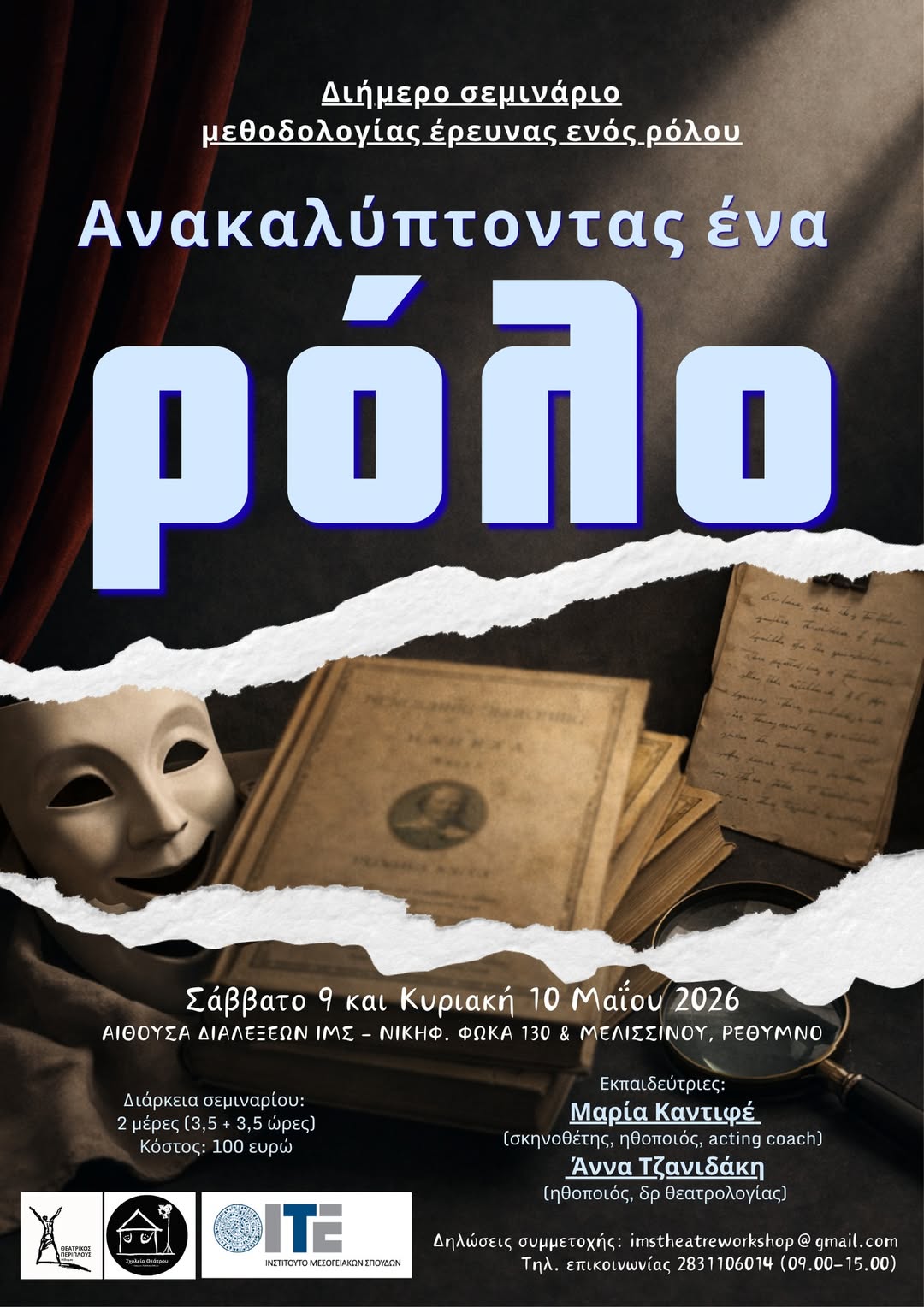 Ο Τομέας Θεατρολογίας του Ινστιτούτου Μεσογειακών Σπουδών οργανώνει διήμερο σεμινάριο μεθοδολογίας έρευνας ενός ρόλου με τίτλο «Ανακαλύπτοντας έναν ρόλο», σε συνεργασία με τον Θεατρικό Περίπλου, το Σάββατο 9 και Κυριακή 10 Μαΐου 2026. Το σεμινάριο θα συντονίσουν η ηθοποιός, σκηνοθέτης, δασκάλα υποκριτικής και acting coach Μαρία Καντιφέ και η Άννα Τζανιδάκη, ηθοποιός και δρ. Θεατρολογίας του Πανεπιστημίου Κρήτης.Θεατρικές Παραστάσεις