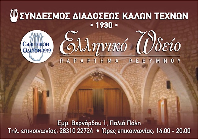 Το Διοικητικό Συμβούλιο του Συνδέσμου Διαδόσεως Καλών Τεχνών Ρεθύμνου και ο Σύλλογος Διδασκόντων του Ελληνικού Ωδείου ανακοινώνουν την έναρξη της νέας σχολικής χρονιάς 2025-26 . Οι εγγραφές θα γίνονται στη γραμματεία του ωδείου καθημερινά από Δευτέρα έως Παρασκευή κατά τις ώρες 14:00-20:00, στο χώρο του Ωδείου, Εμμ Βερνάδου 1 – Παλιά πόλη Ρεθύμνου.