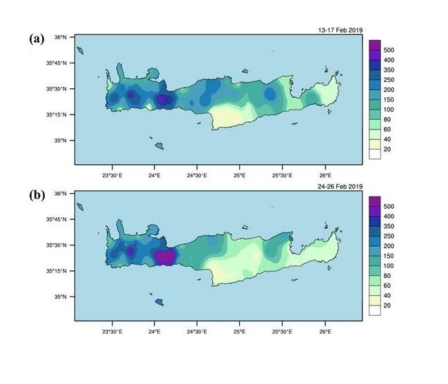 Υπενθυμίζουμε ότι μέσα στο μήνα δύο ισχυρές κακοκαιρίες έπληξαν τη χώρα: η Χιόνη από τις 13 έως τις 17 Φεβρουαρίου και η Ωκεανίδα από τις 24 έως τις 26 Φεβρουαρίου 2019. Στο παρακάτω γράφημα παρουσιάζεται η κατανομή του συνολικού ύψους βροχής που μετρήθηκε κατά τη διάρκεια των δύο κακοκαιριών.
