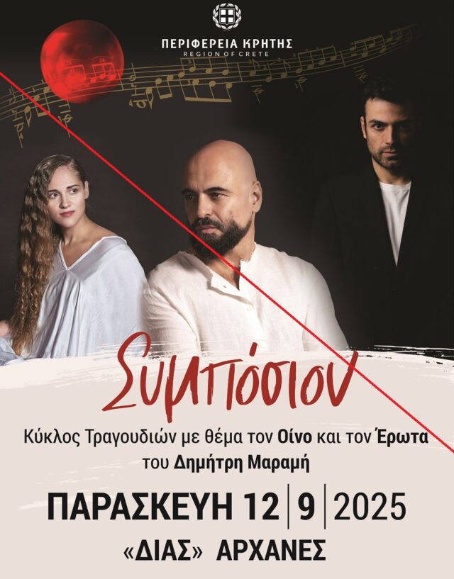 Η Περιφέρεια Κρήτης, συμμετέχοντας στο πένθος της τοπικής κοινωνίας για την άδικη και πρόωρη απώλεια του 17χρονου Γιώργου Τσατσαράκη, ανακοινώνει την αναβολή της εκδήλωσης του Φεστιβάλ Κρήτης «Συμπόσιον» του Δημήτρη Μαραμή, που ήταν προγραμματισμένη να πραγματοποιηθεί την Παρασκευή 12 Σεπτεμβρίου 2025 και ώρα 21:00, στο Κέντρο Σεμιναρίων και Εκπαίδευσης «Δίας» στις Αρχάνες.