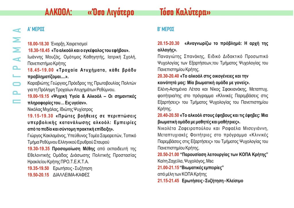 Με σύνθημα «Αλκοόλ: Όσο Λιγότερο, Τόσο Καλύτερα», ξεκινάει στο Ρέθυμνο η καμπάνια ενημέρωσης «Άνοιξη της Πρόληψης για το Αλκοόλ 2025», με στόχο την ευαισθητοποίηση της κοινωνίας για τις επιπτώσεις της προβληματικής κατανάλωσης αλκοόλ.