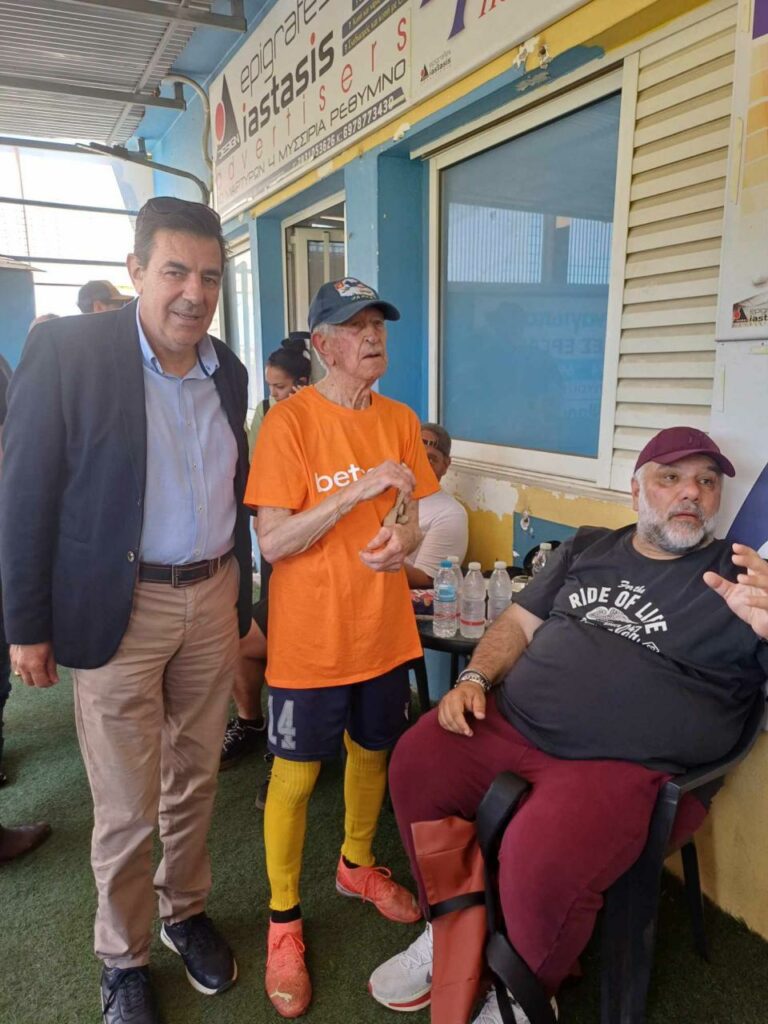 Ο 94χρονος, αλλά αειθαλής παλαίμαχος τερματοφύλακας θυμήθηκε τα νιάτα του υπερασπιζόμενος την εστία του σε έναν αγώνα με πολύ κέφι που μάλιστα καλύφθηκε και τηλεοπτικά από την εκπομπή “The Roadshow» που προβάλλεται στον τηλεοπτικό σταθμό ΑΝΤ1, παρόντος μάλιστα και του δημοφιλούς παρουσιαστή και φίλου του Ρεθύμνου, Γρηγόρη Αρναούτογλου.