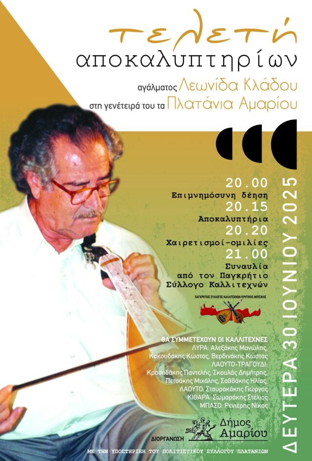 Ο Δήμος Αμαρίου και ο Πολιτιστικός Σύλλογος Πλατανίων διοργανώνουν τη Δευτέρα 30 Ιουνίου και ώρα 20:00 μια ξεχωριστή εκδήλωση μνήμης και τιμής στη γενέτειρα του σπουδαίου λυράρη και συνθέτη Λεωνίδα Κλάδου, τα Πλατάνια Αμαρίου.