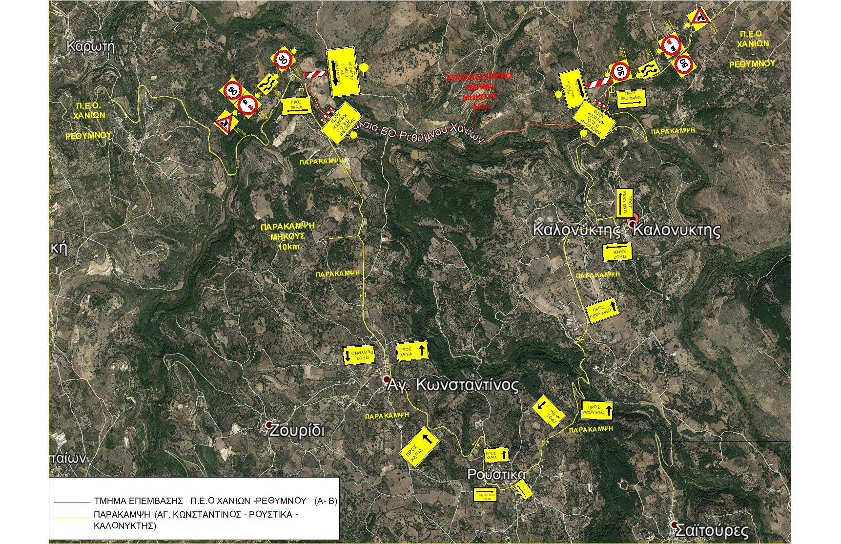 Κατά την εφαρμογή των  συγκεκριμένων κυκλοφοριακών ρυθμίσεων οι οδηγοί καλούνται απότις 06/10/2021 να χρησιμοποιούν ως εναλλακτική διαδρομή το επαρχιακό οδικό δίκτυο που διέρχεται από τους οικισμούς Αγ. Κωνσταντίνο – Ρούστικα – Καλονύκτη μέχρις ότου καταστεί ασφαλής η διαδρομή μέσω της Π.Ε.Ο. Χανίων – Ρεθύμνου. Η άρση των ως άνω κυκλοφοριακών ρυθμίσεων θα πραγματοποιηθεί μετά από νεότερο δελτίο τύπου.