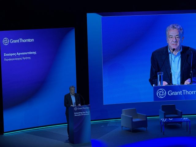 Το όραμα για την Κρήτη της επόμενης δεκαετίας, μια Κρήτη δυναμική, βιώσιμη και ευφυή, παρουσίασε ο Περιφερειάρχης Κρήτης Σταύρος Αρναουτάκης, μιλώντας στην εκδήλωση της Grant Thornton με τίτλο “Unlocking the Next Decade of Growth”, που πραγματοποιήθηκε σήμερα στο Πολιτιστικό Συνεδριακό Κέντρο Ηρακλείου, παρουσία του Υπουργού Εθνικής Οικονομίας και Οικονομικών Κυριάκου Πιερρακάκη.