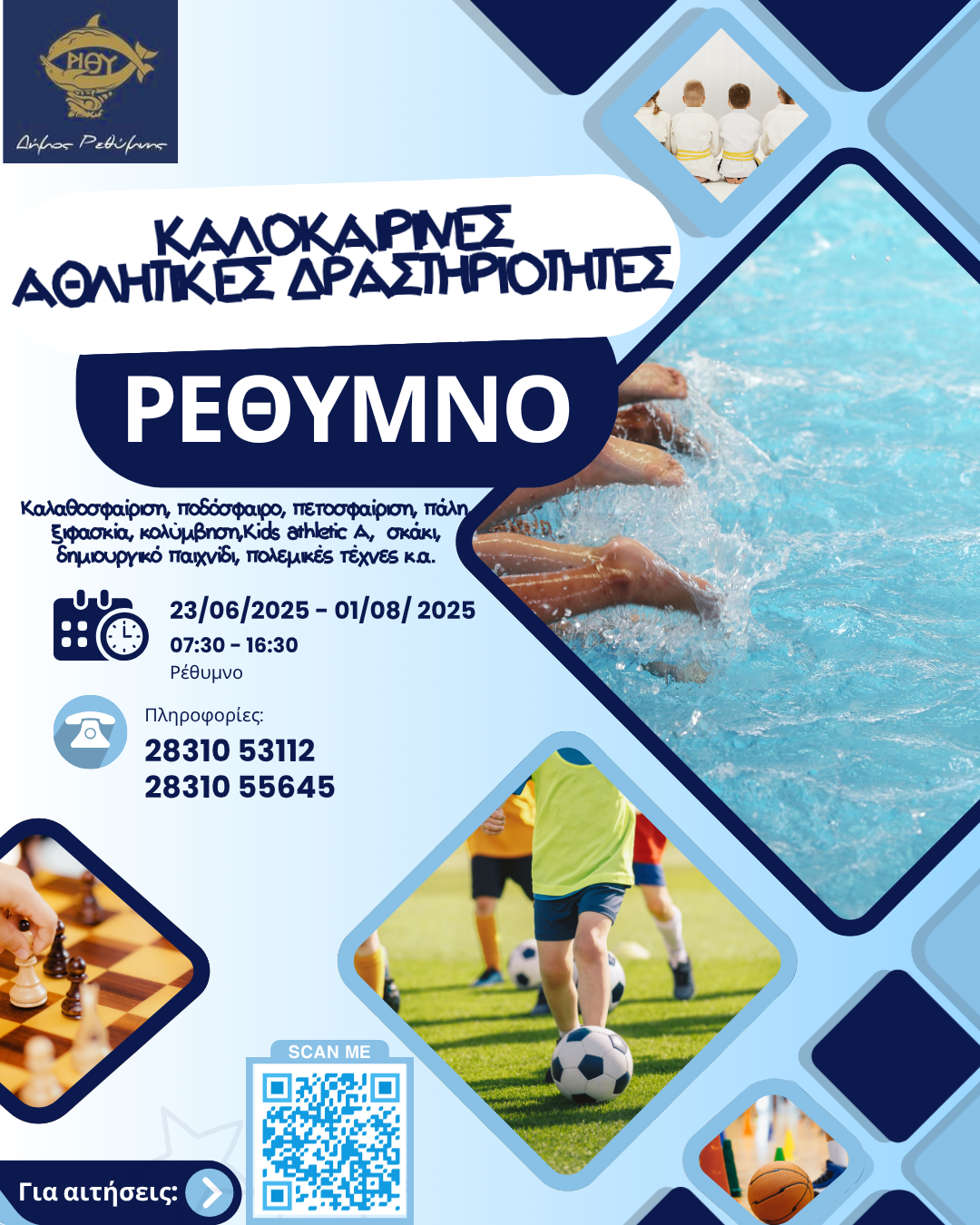 Οι δραστηριότητες θα φιλοξενηθούν στα κλειστά γήπεδα «Μελίνα Μερκούρη» και Περιβολίων, στο ποδοσφαιρικό γήπεδο της Σοχώρας και στο κολυμβητήριο του Ναυτικού Ομίλου Ρεθύμνης.