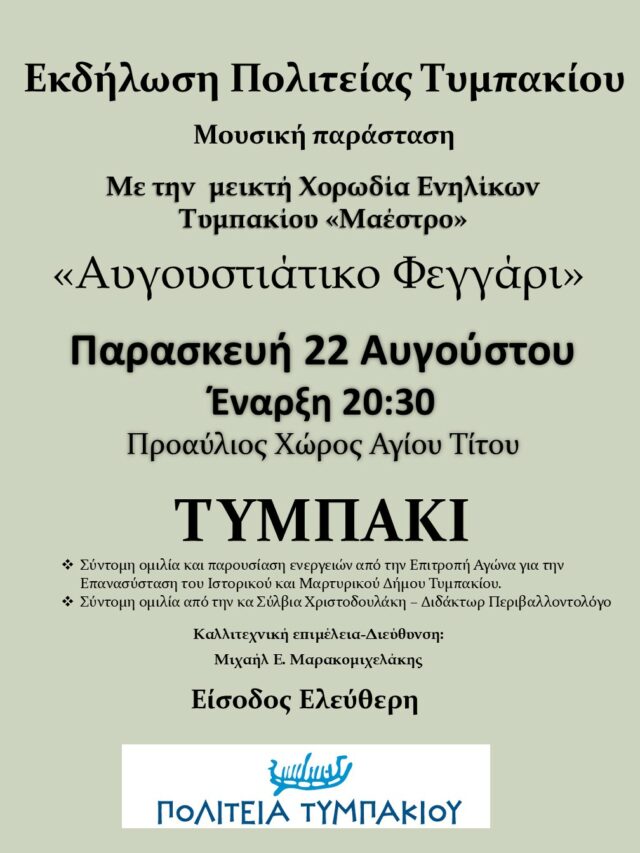 Το Διοικητικό Συμβούλιο της ΠΟΛΙΤΕΙΑΣ ΤΥΜΠΑΚΙΟΥ σας προσκαλεί σε μουσική παράσταση με τίτλο «Αυγουστιάτικο Φεγγάρι» σε συνεργασία με την Μεικτή Χορωδία Ενηλίκων Τυμπακίου «Μαέστρο» που θα πραγματοποιηθεί την Παρασκευή 22 Αυγουστου 2025 και ώρα 20:30, στον προαύλιο χώρο του Ι.Ν. Αγίου Τίτου Τυμπακίου στο κέντρο της πόλης μας στο Τυμπάκι.