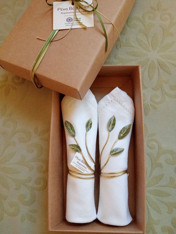 - 1ο Βραβείο: Σετ πετσετών φαγητού με χειροποίητα δαχτυλίδια από μέταλλο ορείχαλκου, εμπνευσμένα από την ελιά – Ειρήνη Βασιλάκη.