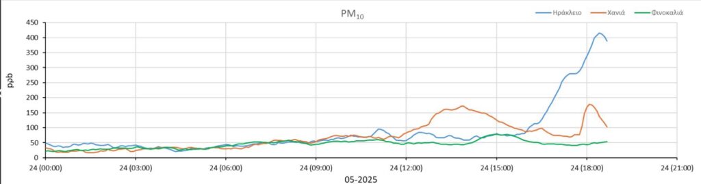 Σημαντική επιβάρυνση της ποιότητας του αέρα σήμερα Σάββατο και αύριο Κυριακή στην Κρήτη λόγω της μεταφοράς αφρικανικής σκόνης (ΑΣ10).