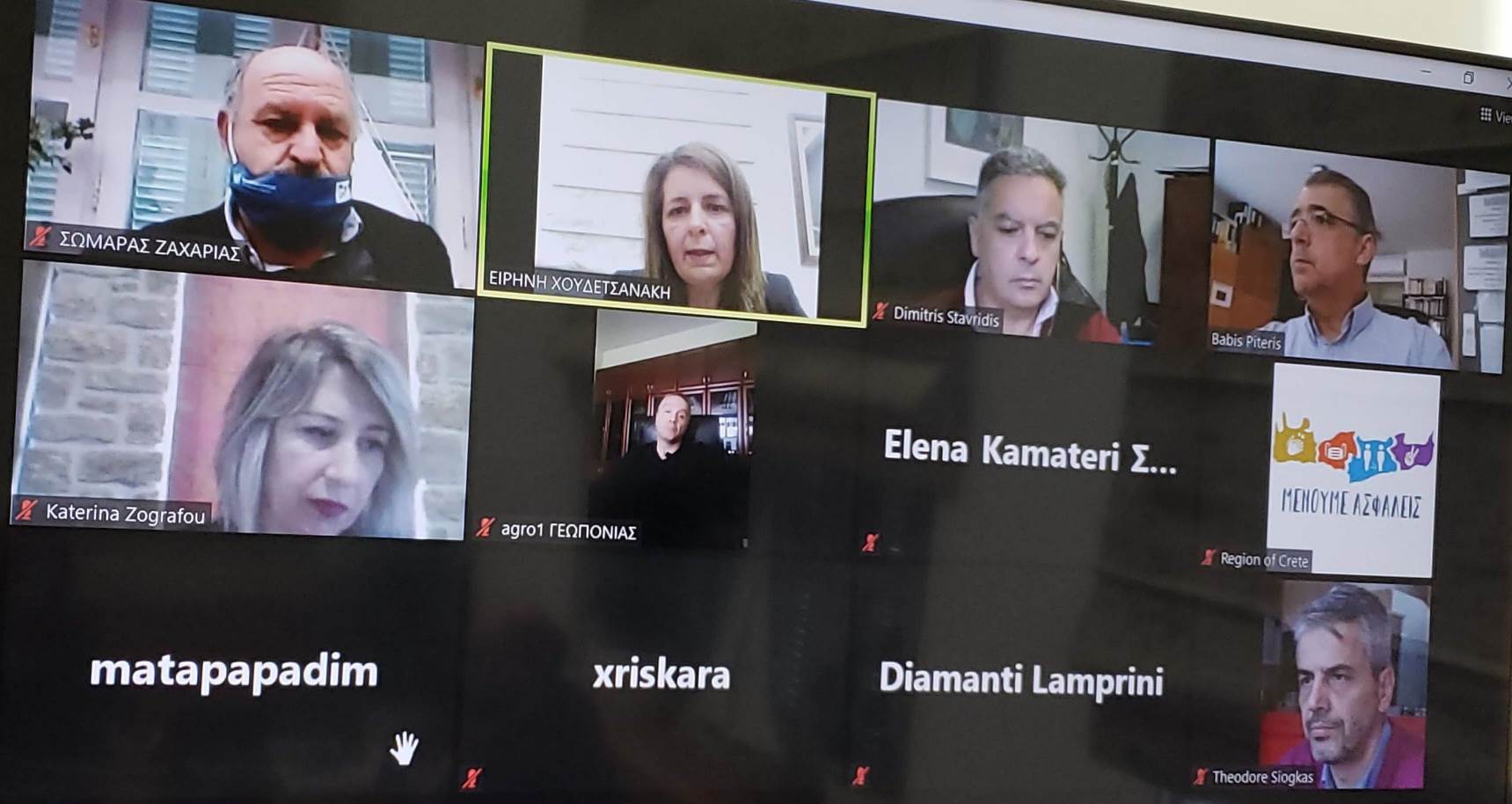 Κατά τη διάρκεια της τηλεδιάσκεψης, ο Χαράλαμπος-Νικόλαος Πίτερης, Επιστημονικός Συνεργάτης της Περιφέρειας Κρήτης, παρουσίασε τα Υφιστάμενα Συστήματα Επισήμανσης Τροφίμων στην Ε.Ε. ενώ ο Γενικός Δ/ντής Πρωτογενούς Τομέα της Περιφέρειας Κρήτης Ζαχαρίας Σωμαράς, επεσήμανε την ιδιαιτερότητα των Γεωγραφικών Ενδείξεων, τη σημαντική διατροφική τους αξία, παράλληλα με το χαμηλό περιβαλλοντικό και ενεργειακό τους αποτύπωμα.