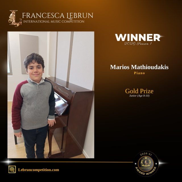 Συγκεκριμένα, στον διεθνή διαγωνισμό Francesca Lebrun International Music Competition, ο Μάριος Μαθιουδάκης (10 ετών) απέσπασε το Gold Prize στην κατηγορία πιάνου ηλικιών 8-10 ετών.