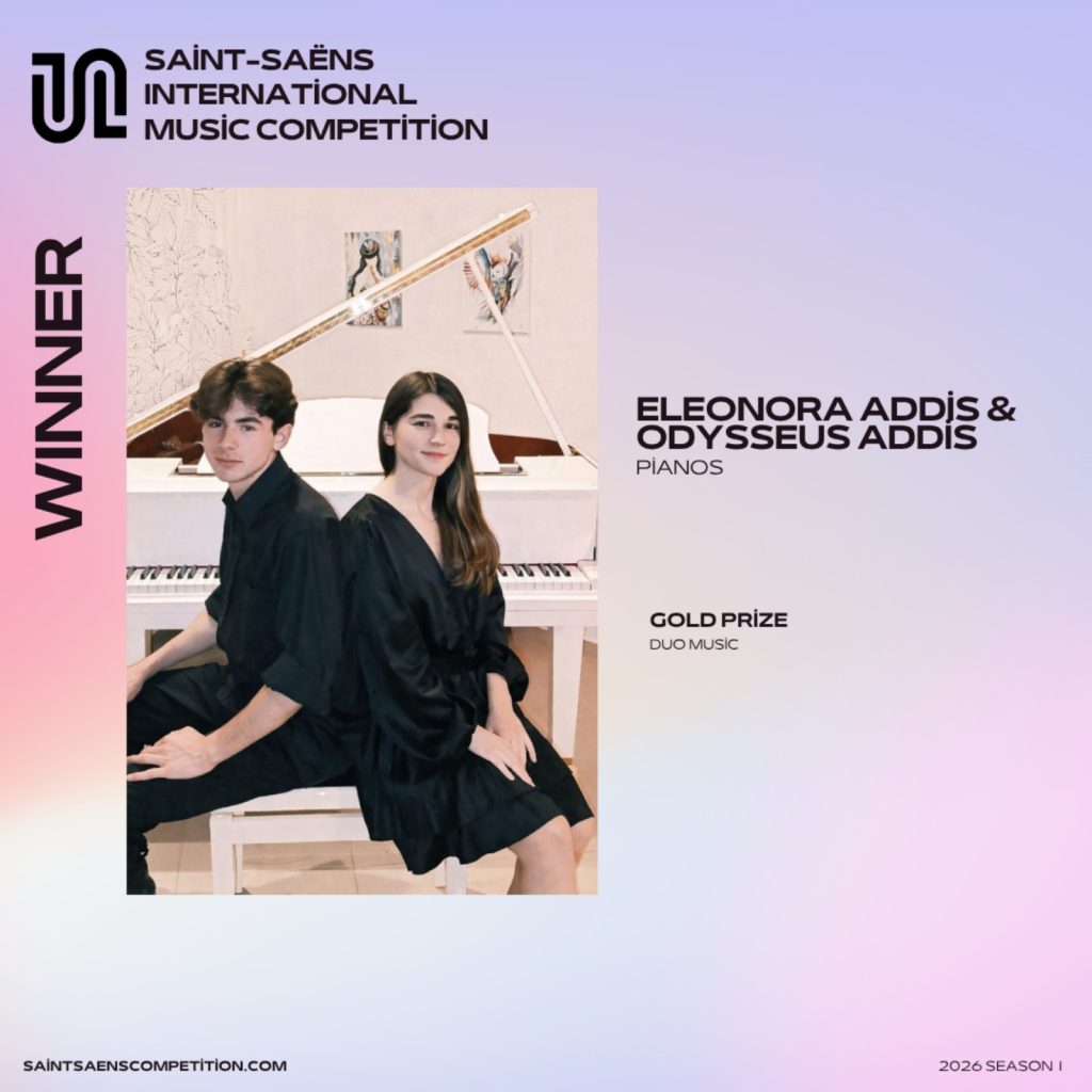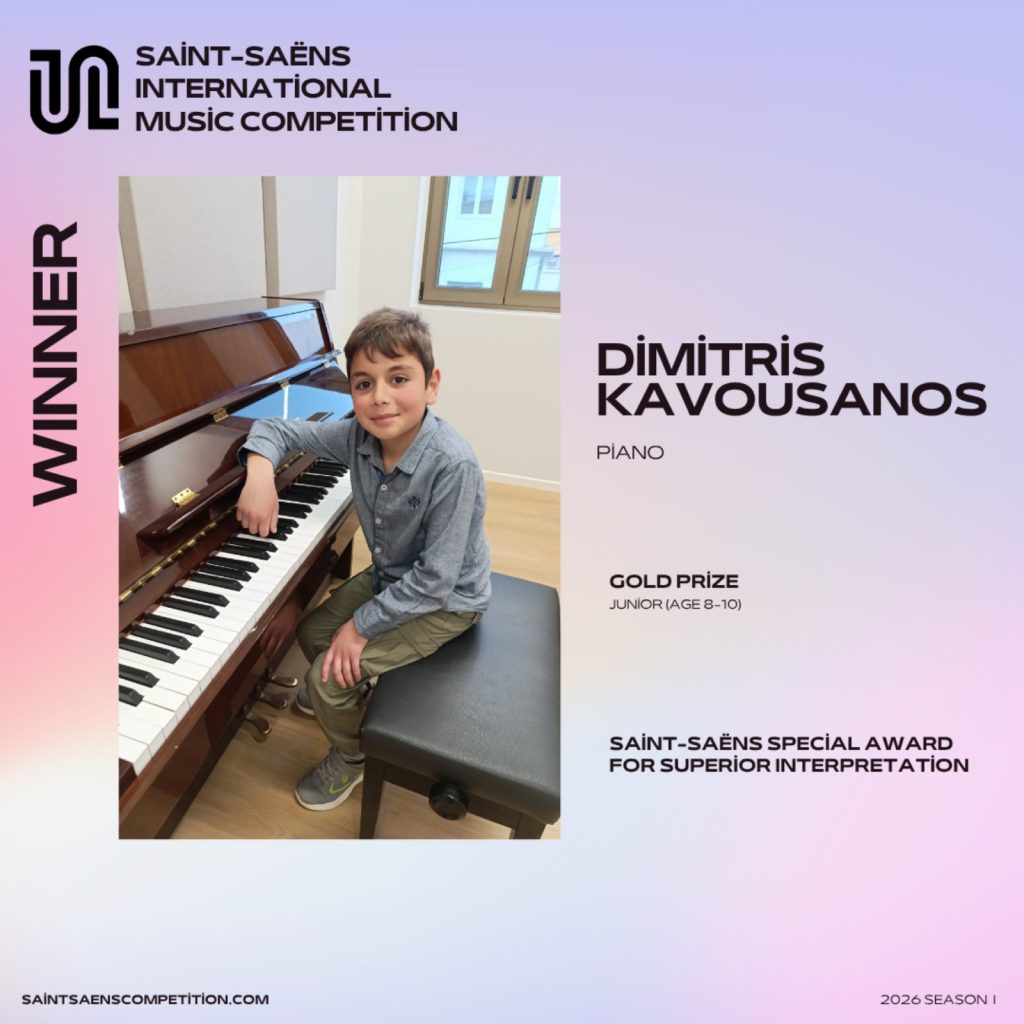 Παράλληλα, στον διεθνή διαγωνισμό Saint-Saëns International Music Competition, ο Δημήτρης Καβουσανός (9 ετών) κατέκτησε το Gold Prize στην κατηγορία πιάνου ηλικιών 8-10 ετών, λαμβάνοντας επιπλέον ειδικό βραβείο για ανώτερη ερμηνεία, ενώ οι Οδυσσέας Άντης και Ελεονόρα Άντης διακρίθηκαν επίσης με Gold Prize στην κατηγορία ντουέτων (πιάνο 4 χέρια) για όλες τις ηλικίες.