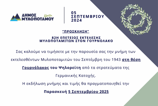 Ο Δήμος Μυλοποτάμου σας προσκαλεί να τιμήσετε με την παρουσία σας την 82η Επέτειο Εκτέλεσης των Μυλοποταμιτών στον Γουρνόλακο, τον Σεπτέμβριο του 1943, από τα στρατεύματα της Γερμανικής Κατοχής.