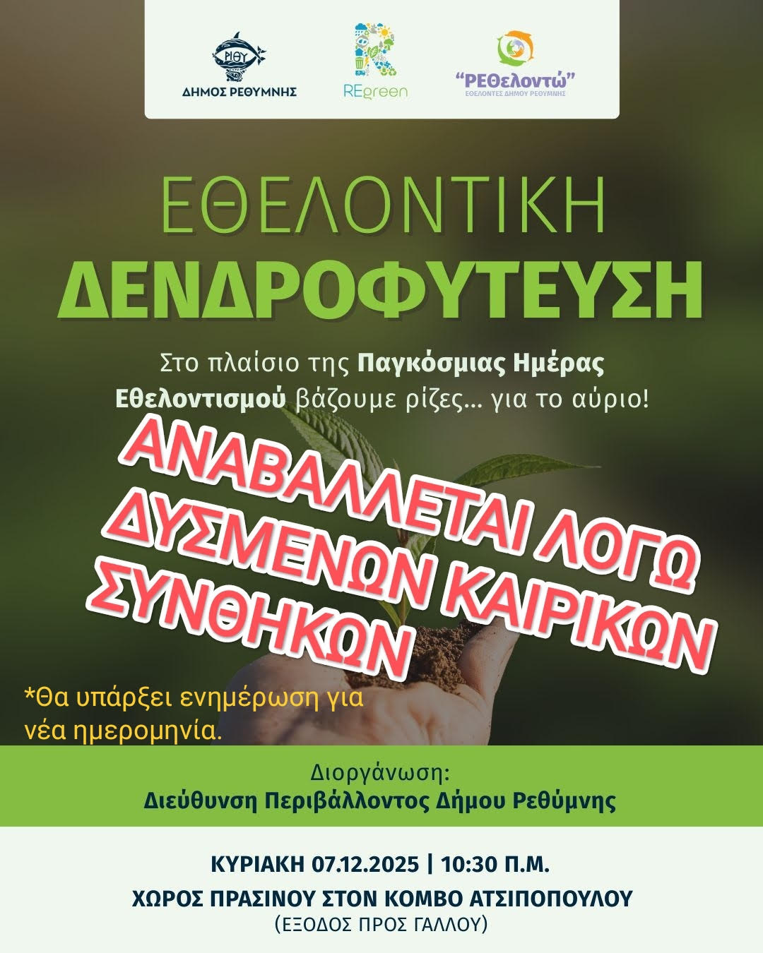 Ο Δήμος Ρεθύμνης ενημερώνει ότι λόγω δυσμενών καιρικών συνθηκών αναβάλλεται η εκδήλωση της Εθελοντικής Δενδροφύτευσης που επρόκειτο να πραγματοποιηθεί στο πλαίσιο της Παγκόσμιας Ημέρας Εθελοντισμού, την Κυριακή, 7 Δεκεμβρίου στις 10:30 στον Κόμβο του Ατσιπόπουλο.