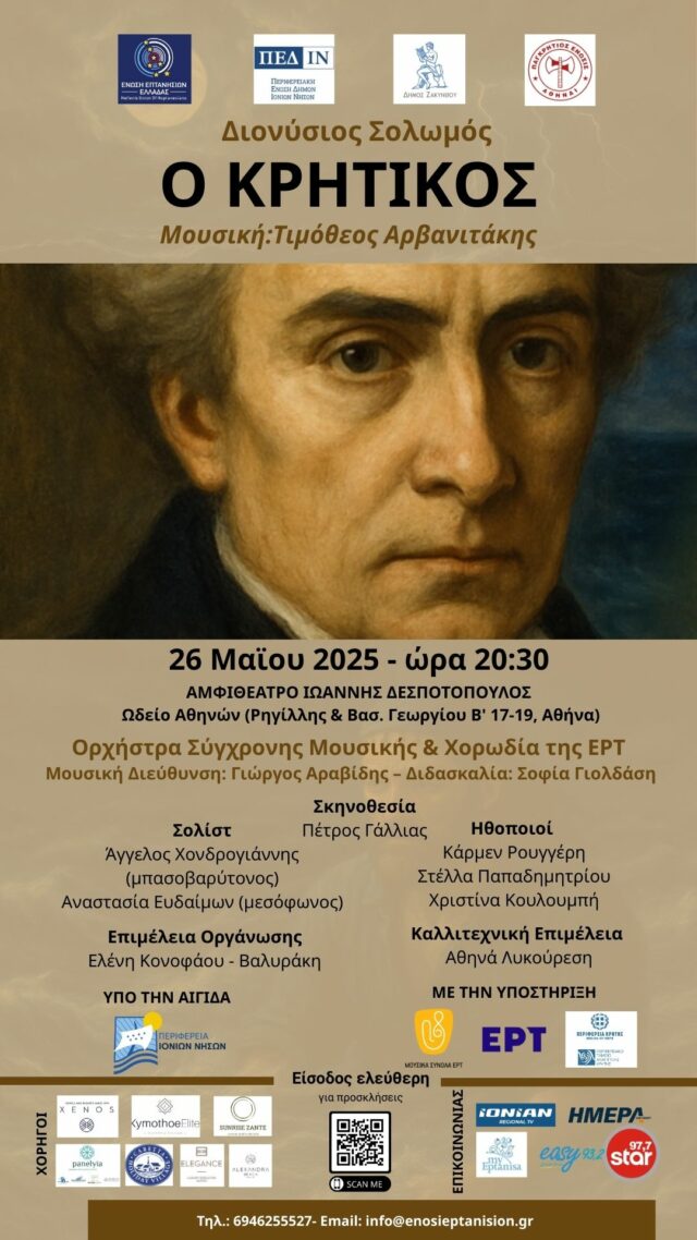 Μέσα από το σολωμικό αριστούργημα, η Κρήτη και τα Επτάνησα — δύο νησιωτικοί κόσμοι σε αμοιβαίο πνευματικό διάλογο — συνομιλούν ποιητικά, ανταλλάσσοντας μνήμες, αξίες και οράματα. Η παράσταση «Ο Κρητικός» είναι κάτι περισσότερο από μια μουσική βραδιά, είναι ένα σύμβολο ενότητας, αντίστασης και πολιτισμικής ταυτότητας.