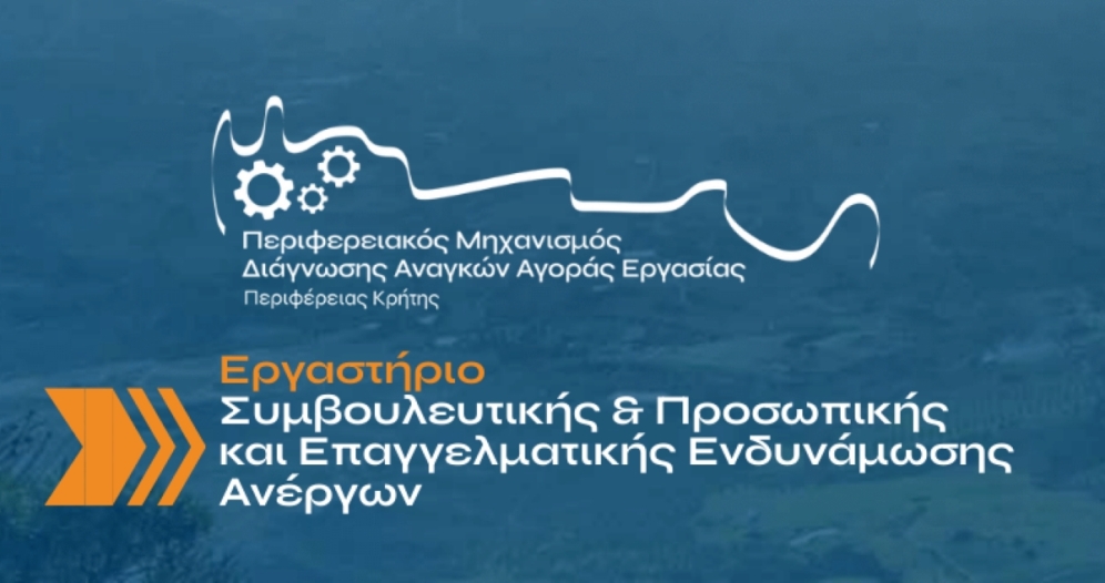 Πρόσκληση συμμετοχής σε βιωματικό «Εργαστήριο Συμβουλευτικής & Προσωπικής και Επαγγελματικής Ενδυνάμωσης», απευθύνει η Περιφέρεια Κρήτης, στο πλαίσιο των δράσεων του Περιφερειακού Μηχανισμού Διάγνωσης Αναγκών Αγοράς Εργασίας.