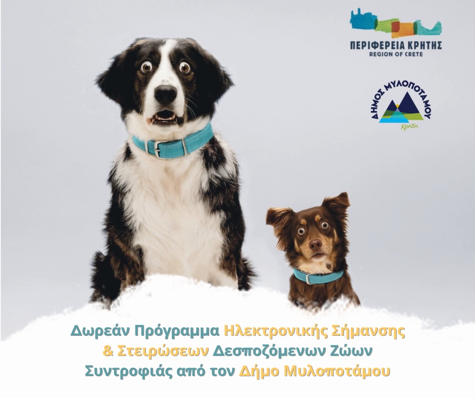 Ο Δήμος Μυλοποτάμου, στα πλαίσια της πολιτικής του για την προστασία και ευζωία των ζώων συντροφιάς, ανακοινώνει την υλοποίηση δωρεάν προγράμματος ηλεκτρονικής σήμανσης και στειρώσεων για δεσποζόμενα ζώα.