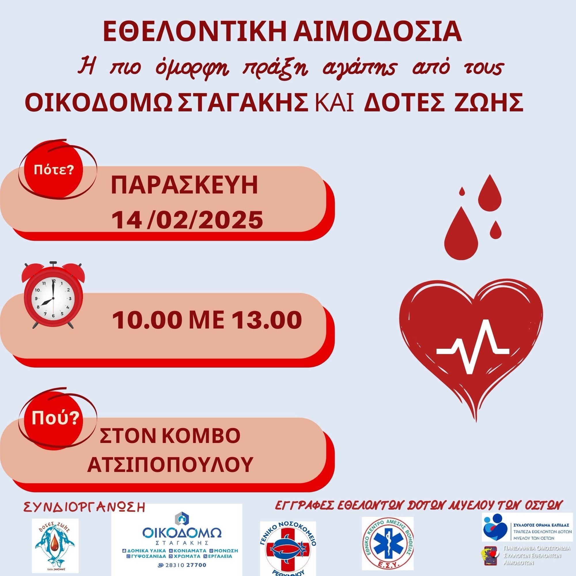 Η διοίκηση και το προσωπικό της εταιρίας “ΟΙΚΟΔΟΜΩ ΣΤΑΓΑΚΗΣ” σε συνεργασία με τον Σύλλογο Εθελοντών Αιμοδοτών Ν. Ρεθύμνου ΔΟΤΕΣ ΖΩΗΣ, σας προσκαλεί να συμμετέχετε σε μία όμορφη πράξη αγάπης προσφέροντας εθελοντικά αίμα, την Παρασκευή, 14 Φεβρουαρίου 2025 στον χώρο που στεγάζεται η εταιρία “Οικοδομώ Σταγάκης” – Κόμβος Ατσιποπούλου ώρες: 10πμ – 1μμ