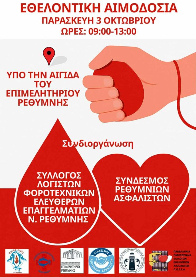 Μια σημαντική πρωτοβουλία εθελοντικής αιμοδοσίας των Ασφαλιστών & Λογιστών του Ν. Ρεθύμνου θα πραγματοποιηθεί την Παρασκευή 3 Οκτωβρίου στο Επιμελητήριο Ρεθύμνης, Εμμ. Πορτάλιου 23 (1ος Όροφος) και Ώρες: 09.00-13.00.