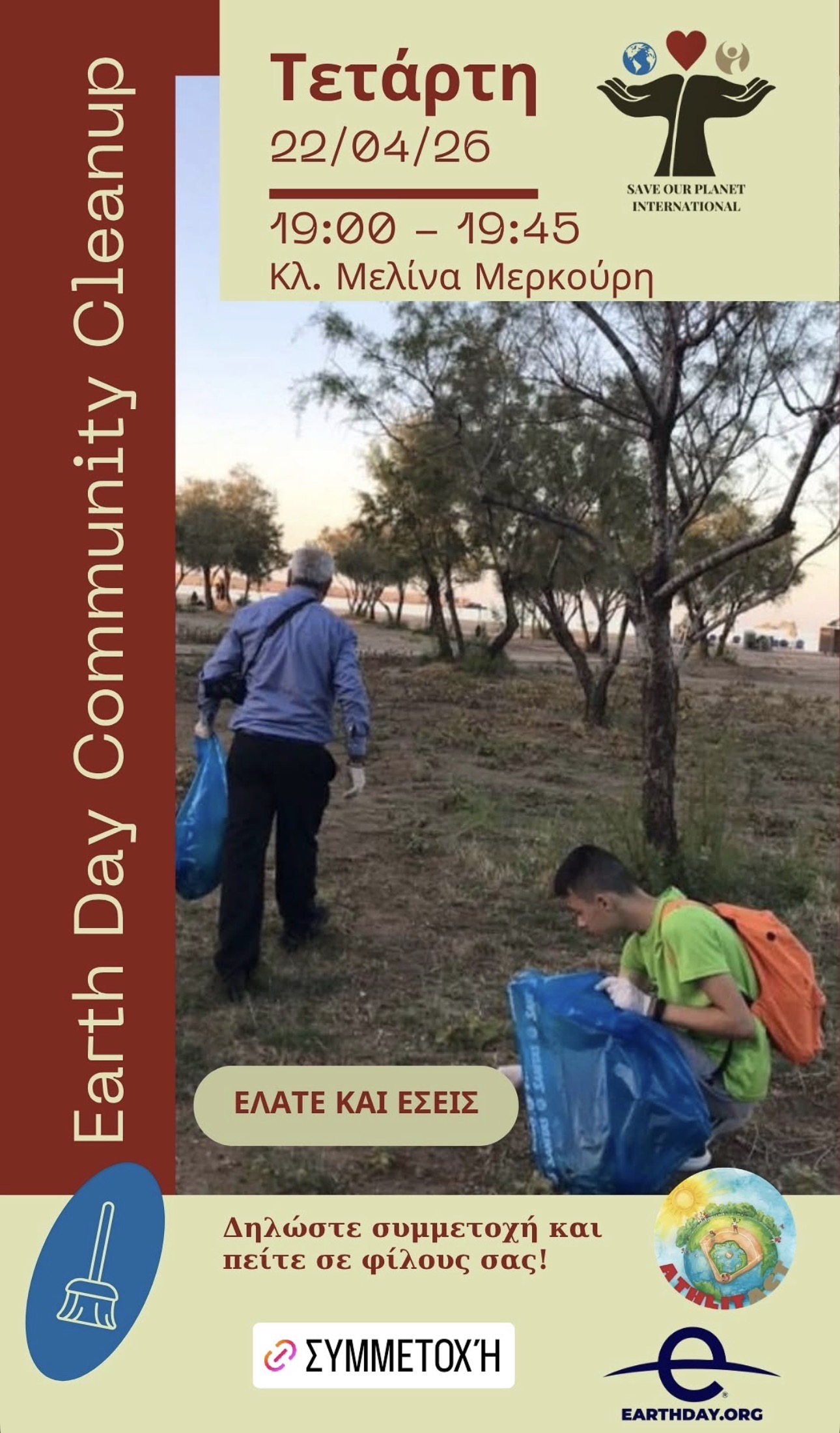 Με αφορμή την Ημέρα της Γης (22/4), η ομάδα Save Our Planet International (SOPI), στο πλαίσιο της διεθνής ημέρας και του προγράμματος AthlitAct, οργανώνει μια σύντομη δράση καθαρισμού (cleanup) στον χώρο γύρω από το Κλειστό Γυμναστήριο Μελίνα Μερκούρη.