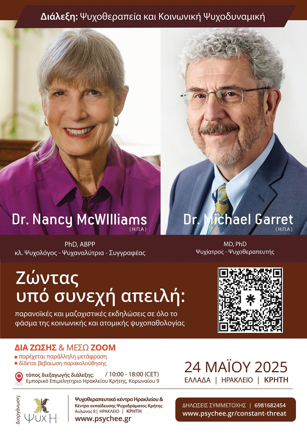 Δύο από τους πλέον καταξιωμένους ψυχοθεραπευτές διεθνώς, η ψυχαναλύτρια και συγγραφέας Dr. Nancy McWilliams και ο ψυχίατρος Dr. Michael Garrett, συναντώνται στο Ηράκλειο σε μια διάλεξη υψηλού επιστημονικού ενδιαφέροντος με θέμα: