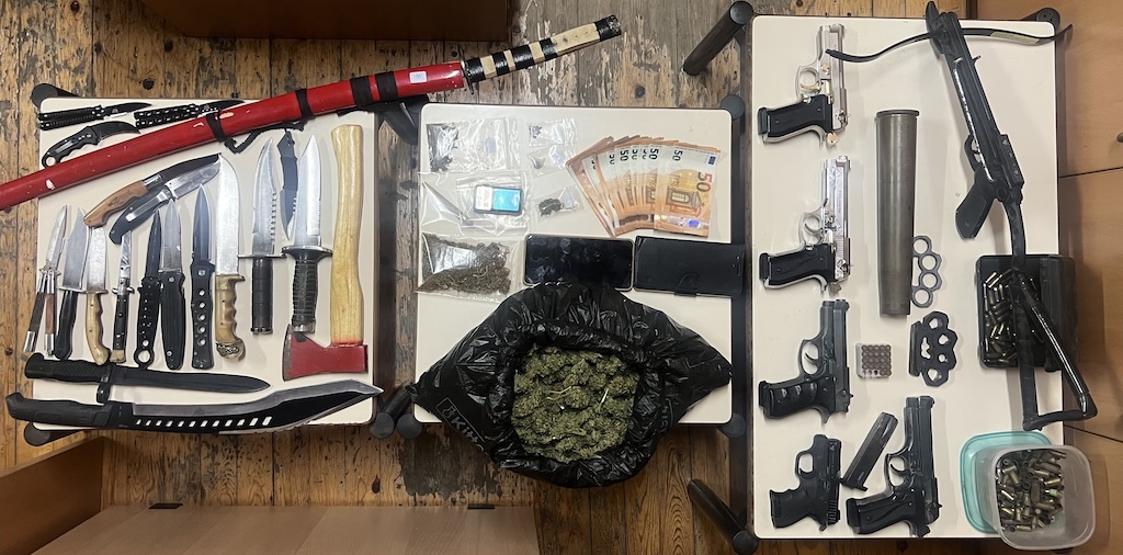 Κατασχέθηκαν μεταξύ άλλων, σχεδόν μισό κιλό κάνναβης, 5 όπλα, φυσίγγια, ζυγαριά και χρηματικό ποσό 1550 ευρώ