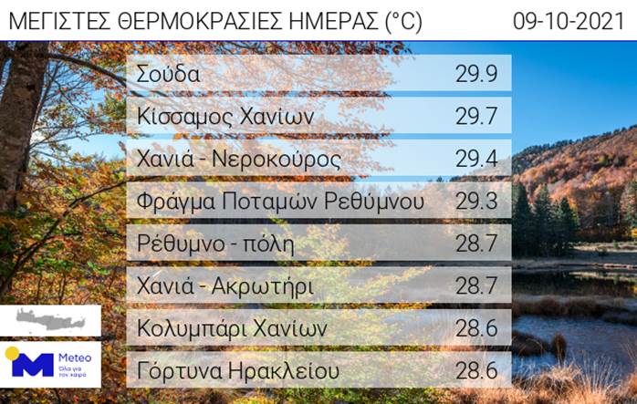 Οι 8 υψηλότερες τιμές θερμοκρασίας που κατέγραψαν οι σταθμοί του Εθνικού Αστεροσκοπείου Αθηνών/meteo.gr στο νησί δίνονται στον πίνακα που ακολουθεί